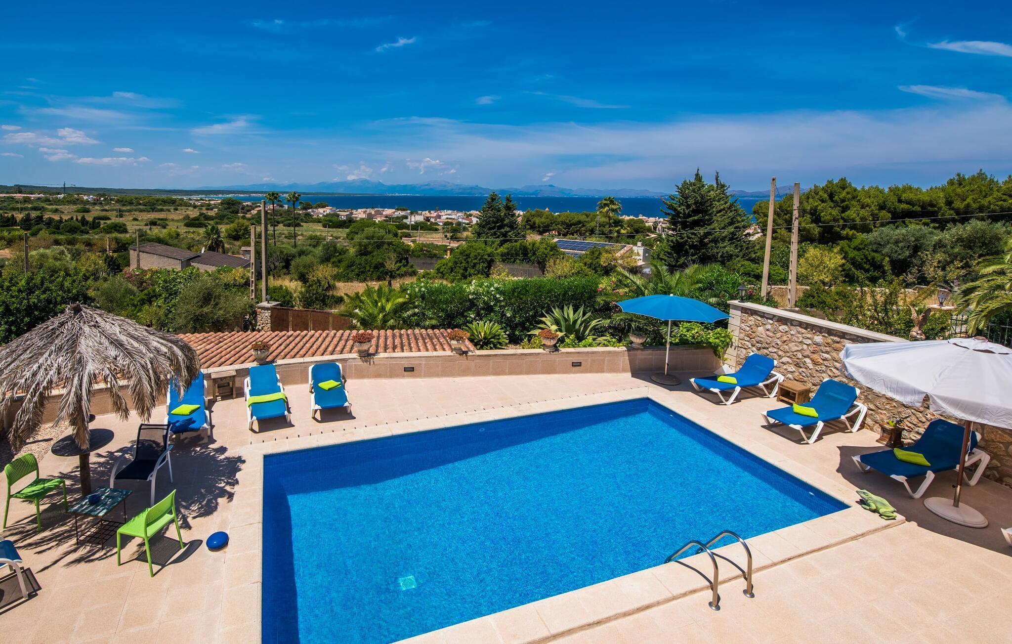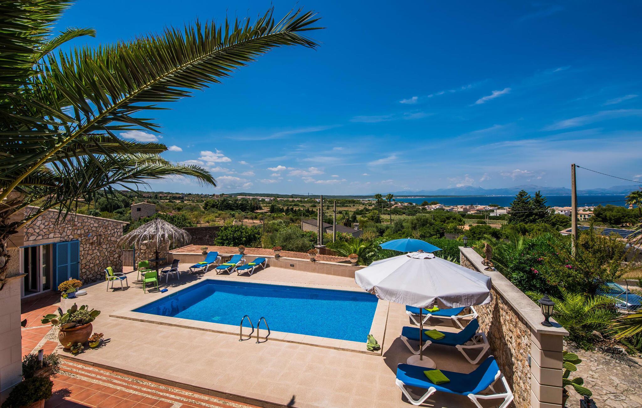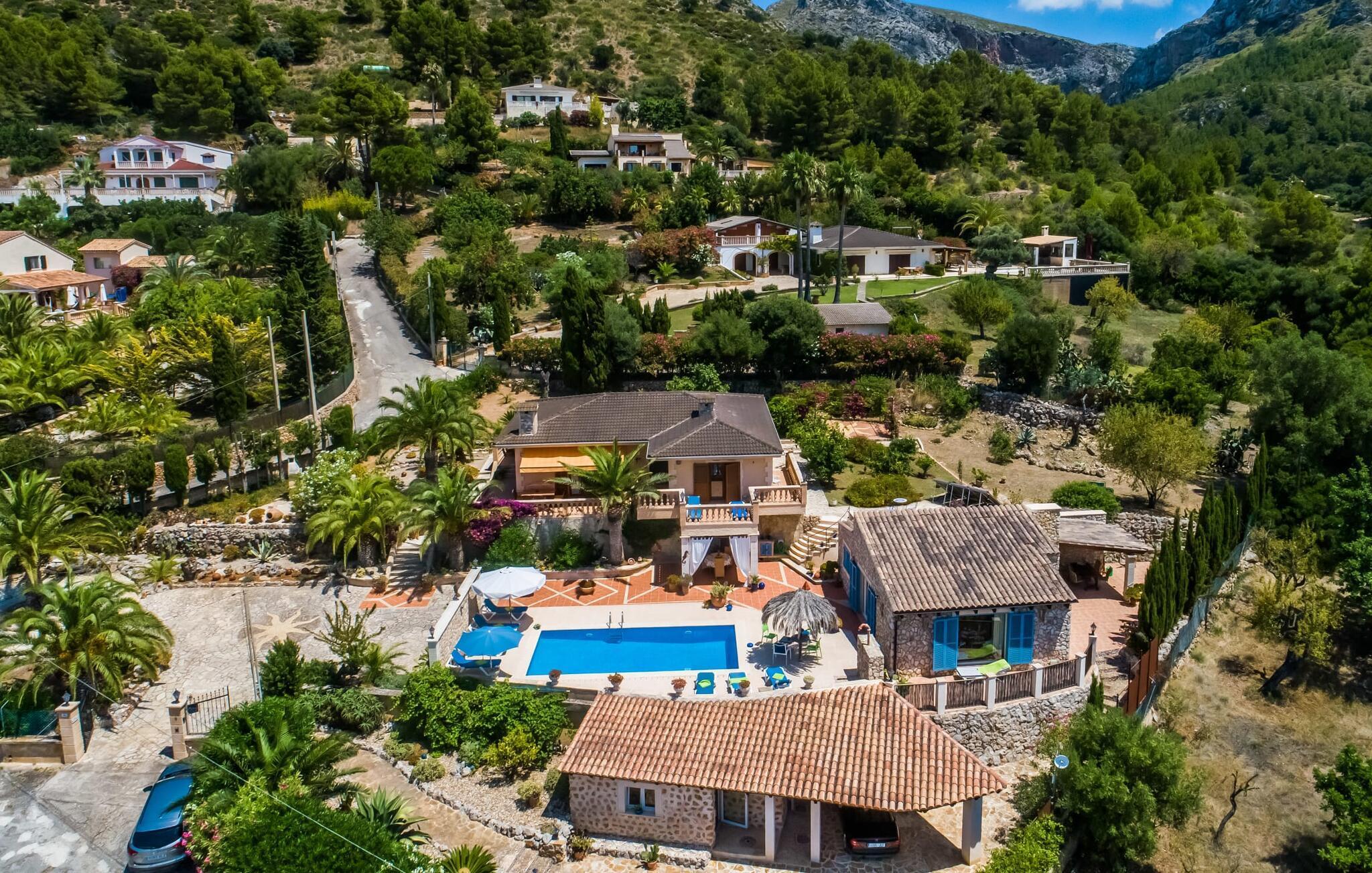 Normalerweise muss man sich zwischen einem Urlaub am Meer oder in den Bergen entscheiden, doch Familien sind sich nicht immer einig. Dies ist bei der Villa „Monte y Mar“ nicht der Fall, deren Name bereits verrät, was geboten wird: Von der weitläufigen Terrassenlandschaft vor dem Haus aus können Sie zum einen die Kulisse des majestätischen Bergmassivs genießen Hand und zugleich einen wunderbaren Weitblick auf das Meer bis zum Horizont. Die malerische Kulisse des Anwesens ist von einer vielfältigen mediterranen Flora umgeben: Oleander, hohe Palmen, Hibiskus und Kakteen schmücken in Beeten und hübschen Töpfen die Umgebung des Hauses und bilden eine wunderbare optische Ergänzung zu den auf dem Boden und darüber liegenden Steinmaterialien der Hausfassade und dem Blau des Himmels, in den blauen Sonnenliegen und den Mosaikfliesen im Pool. Der 8 m lange Swimmingpool befindet sich in der Mitte der oben genannten Terrasse und bietet so zahlreiche Möglichkeiten zum Sonnenbaden oder Entspannen im Schatten unter der überdachten Fläche. Aufgrund der Klippenlage gibt es eine zweite Ebene mit Balkonen und sogar einen Gartenabschnitt, wo Sie einen gemauerten Grill für stressfreie Grillabende finden. Dieser Bereich ist über Stufen von zwei Seiten zugänglich. Hier wurde auch eine völlig private Sitzgelegenheit zum Entspannen, Spielen oder Lesen eingerichtet. In der Mitte eines runden Kiesbetts, umgeben und bedeckt mit einer Vielzahl einzigartiger Natursteinstücke, steht eine Palme im Mittelpunkt; An seinem Stamm ist eine urige Bank angebracht – ein Ort zum Verweilen, den Sie im Urlaub bestimmt gerne und oft aufsuchen werden. Etwas Schatten finden Sie auf dieser Gartenebene unter den sanft im Wind wiegenden Palmenblättern oder der fest installierten Markise am Haus. Der Meerblick von beiden Terrassenebenen ist einfach traumhaft und gleichzeitig die „schützenden“ Hügel im Rücken. „Monte y Mar“ – hier müssen Sie wirklich keine Kompromisse eingehen!