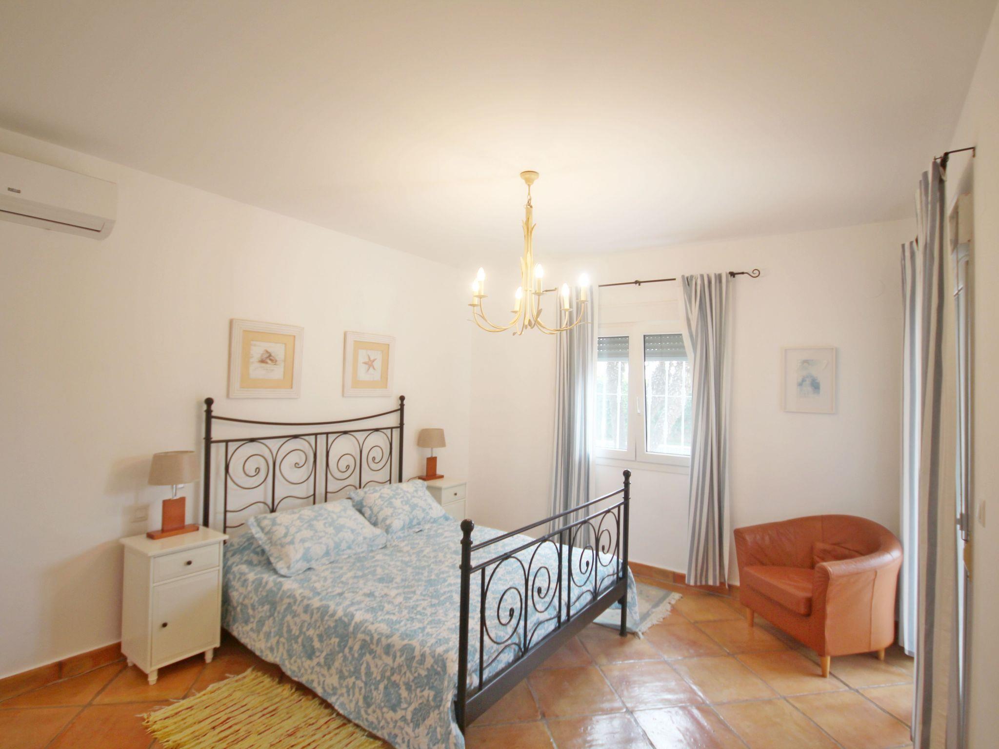 Im Inneren der Villa empfängt Sie ein großzügiger Eingangsbereich, der in ein einladendes Wohnzimmer mit einem offenen Kamin übergeht. Die moderne Küche mit Frühstückstheke und der Zugang zum Esszimmer, ausgestattet mit einer verglasten Wand in Südausrichtung, bietet einen atemberaubenden Blick über das Tal bis zum Meer. Beide Ebenen bieten komfortable Schlafmöglichkeiten, darunter ein Hauptschlafzimmer mit Klimaanlage, Ankleideraum und einem en-suite Badezimmer mit Doppelwaschbecken, sowie weitere Schlafzimmer und Badezimmer für Gäste oder Familie. Alle Schlafzimmer sind mit der Klimaanlage ausgestattet.