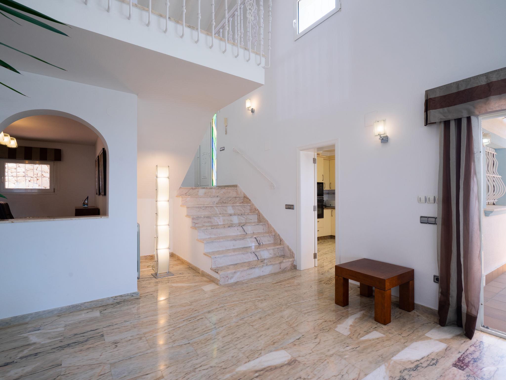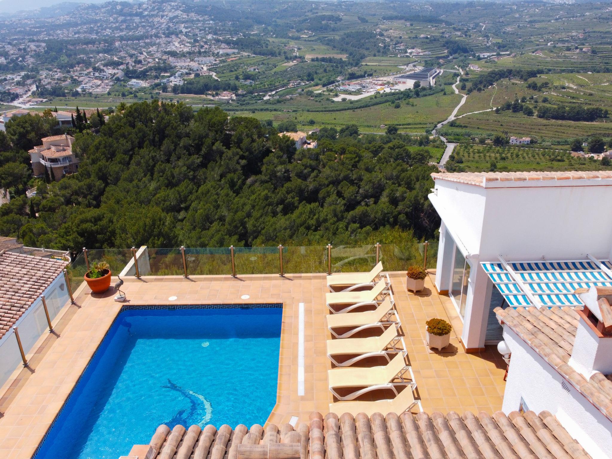 Golden Valley: Schönes, luxuriöses Haus "Stuttgart". 4.5 km vom Zentrum von Moraira, ruhige, sonnige, erhöhte Lage, 4.5 km vom Meer, in einer Sackgasse. Zur Alleinbenutzung: Grundstück 1'100 m2 (eingezäunt), Schwimmbad nicht einsehbar (35 m2, saisonale Verfügbarkeit: 01.Jan. - 31.Dez.) mit Innentreppe. Terrasse, Gartenmöbel, Grillhaus. Im Hause: Sauna, Fitnessraum, Sprudelbad, Zentralheizung. Parkplatz (überdacht). Supermarkt 1.3 km, Restaurant 1.3 km, Bar 1.3 km, Bushaltestelle "Moraira" 4.1 km, Bahnstation "Teulada" 6.3 km, Fähre "Denia" 22.4 km, Sandstrand "Moraira" 4.5 km. Golfplatz (18 Loch) 9 km. Der Besitzer akzeptiert keine Jugendgruppen.
