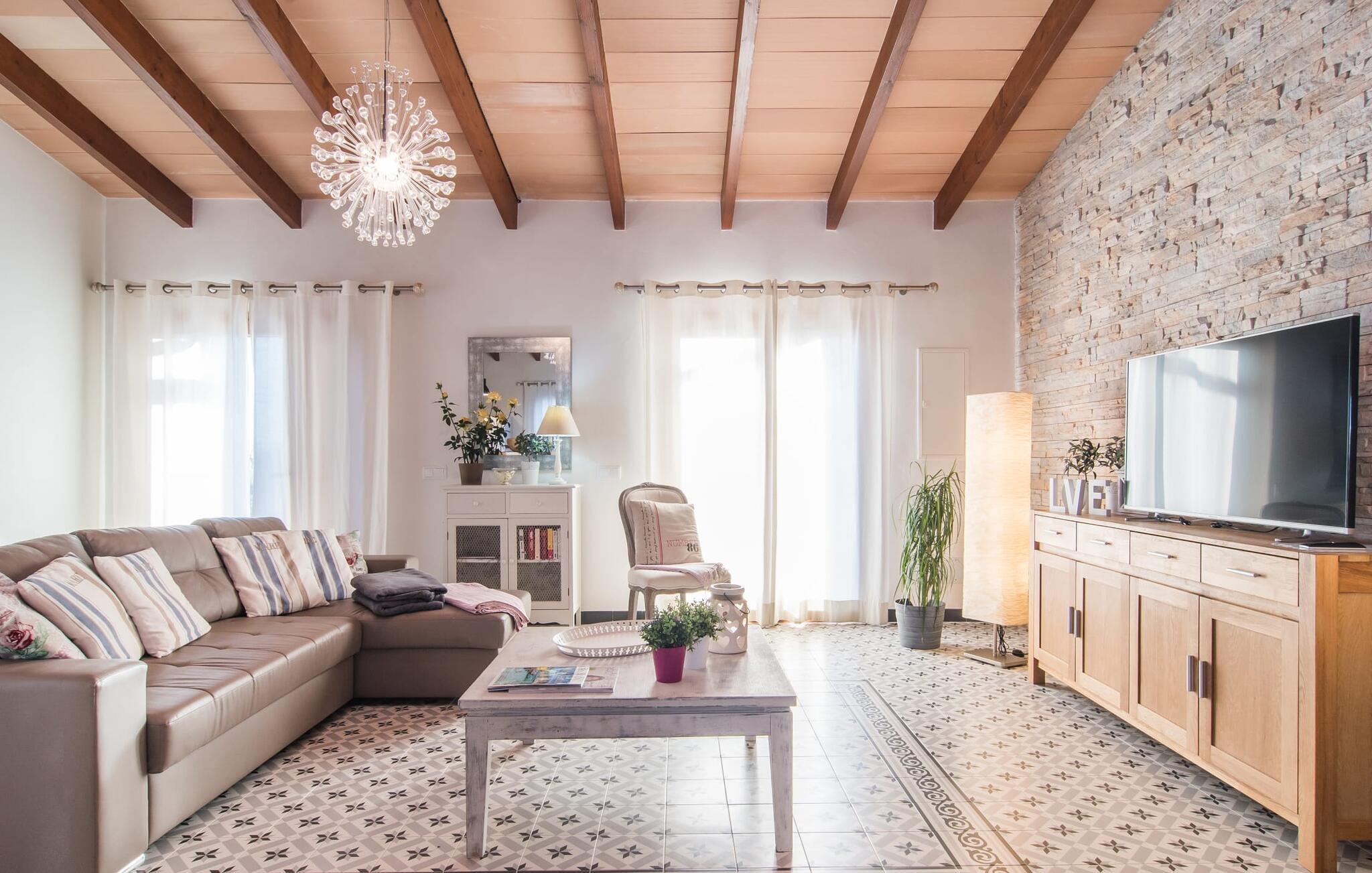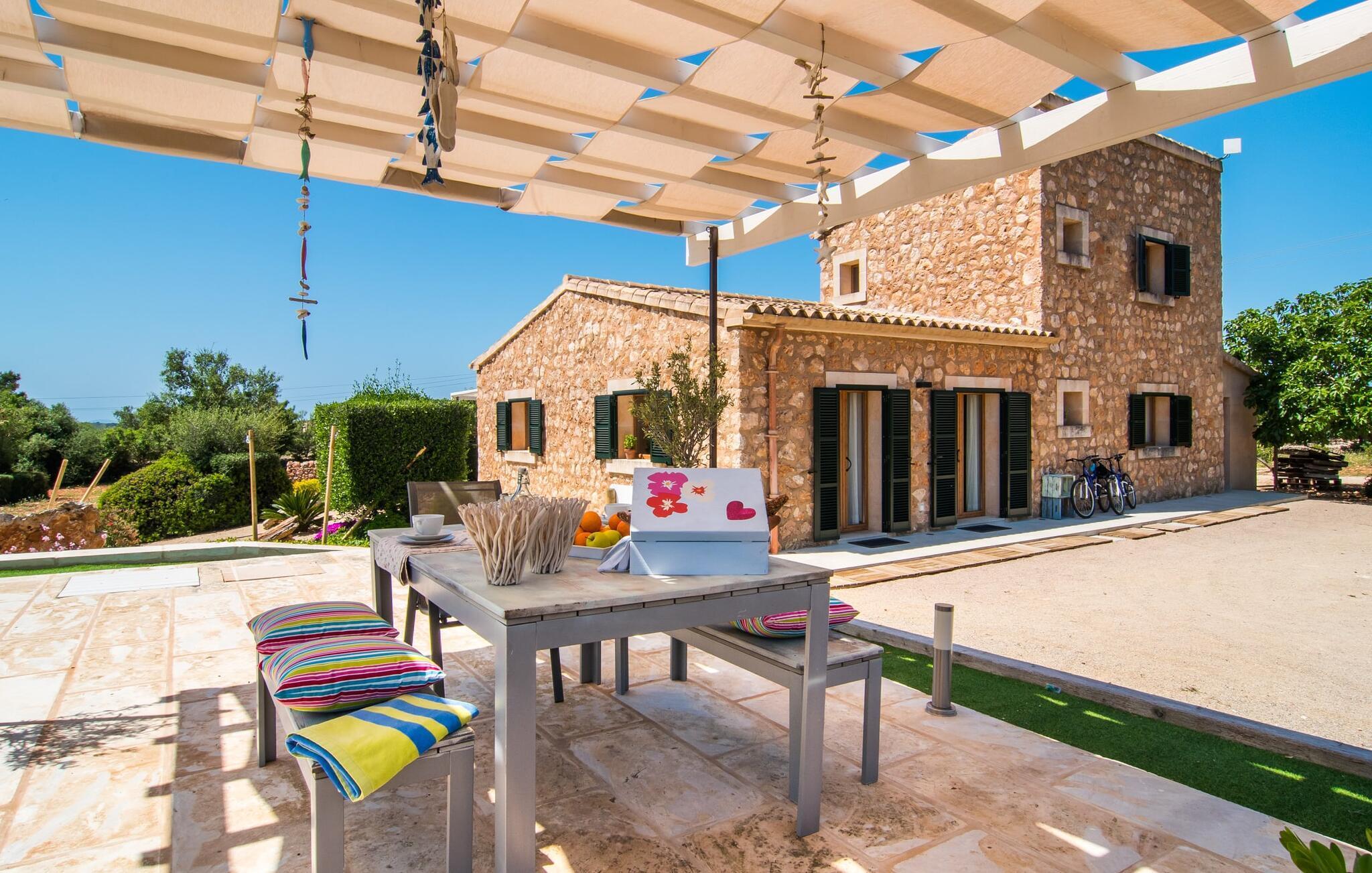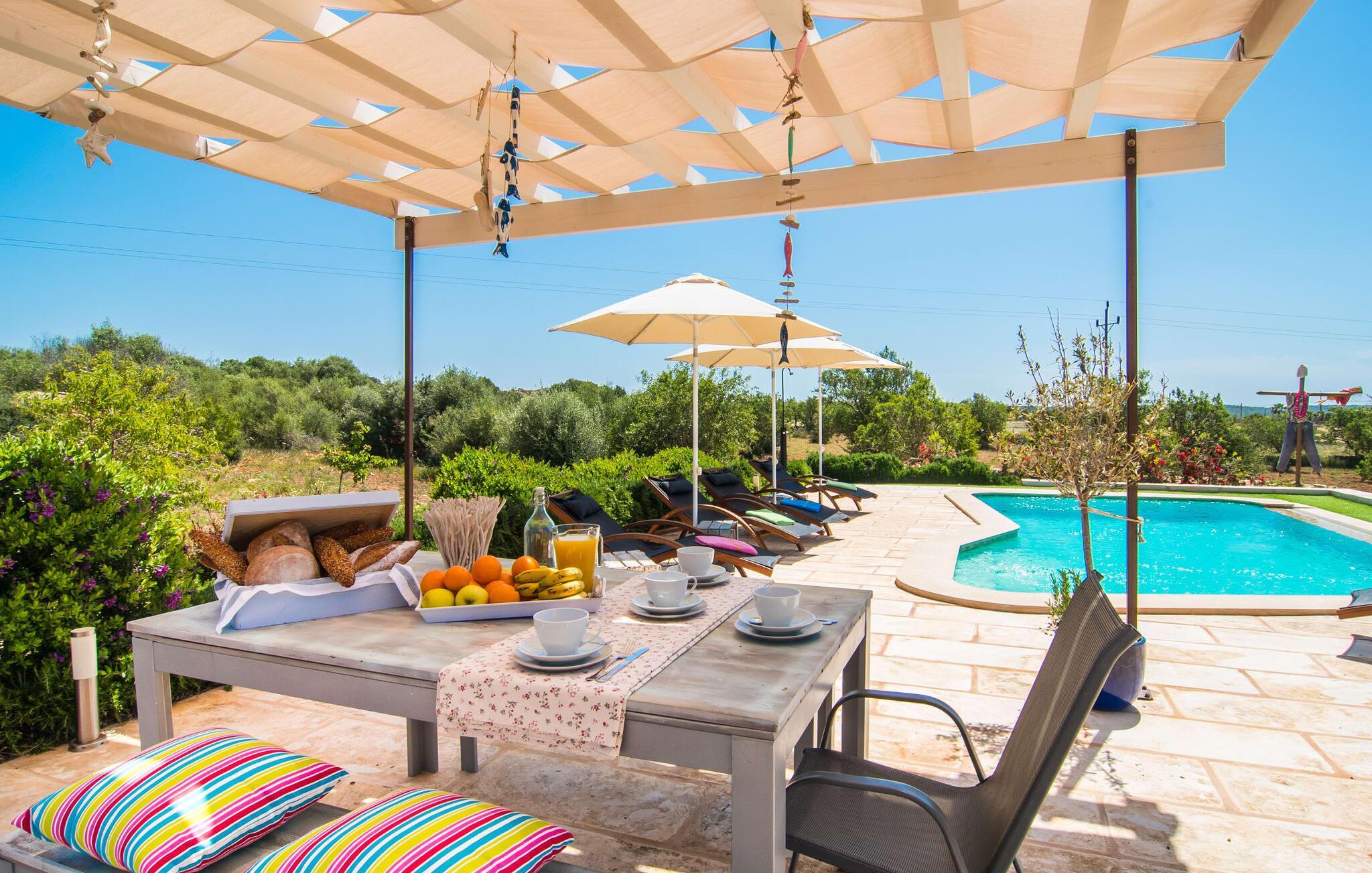 Als wir die Villa „Morell“ besichtigen, erwartet uns eine angenehm weitläufige, teilweise naturbelassene Landschaft, in deren Mitte ein malerisches, von Terrassen umgebenes Haus liegt. Schnell wird uns klar, dass die Eigentümer viel Liebe und Sorgfalt in die Gestaltung und Einrichtung dieser Villa gesteckt haben. Die Terrasse am Haus ist mit einer Markise ausgestattet und wir entdecken schnell, dass es sich hier wunderbar zum Sitzen im Freien eignet. Dies ist ein Ort, an dem Sie eine Weile verweilen und in die Ferne blicken können. Es ist auch ein großartiger Ort, um gemeinsam mit allen zu essen. Praktischerweise ist es auch der beste Ort, um das leicht erhöhte Becken im Auge zu behalten – und auch die Kinder, die unterwegs im Wasser planschen. Große, breite Stufen führen hinunter in den türkis schimmernden Pool – ein herrlicher Ort, um warme Sommertage zu verbringen. Egal, ob Sie im Wasser herumtollen oder ein paar Runden drehen, hier finden Sie immer eine Möglichkeit, sich abzukühlen und zu erfrischen. Unter den Sonnenschirmen bieten Liegestühle den perfekten Platz für ruhige Entspannungssitzungen, bei denen Sie einfach mal die Seele baumeln lassen können. Überlegen Sie sich vor Ihrem Urlaub ein gutes Buch und nehmen Sie es zusammen mit einem kühlen Getränk mit nach draußen, damit Sie Ihren Urlaub im Freien so angenehm wie möglich genießen können. Auf der gegenüberliegenden Seite des Hauses gibt es eine weitere Terrasse, die mit eleganten Stühlen und einem interessanten Tisch aus Versandpaletten ausgestattet ist. Diese recht originelle Art, die Terrasse in zwei Zonen zu unterteilen, ermöglicht die gleichzeitige Nutzung verschiedener Bereiche, sodass Sie auch innerhalb Ihrer Gruppe ganz einfach etwas Privatsphäre haben.