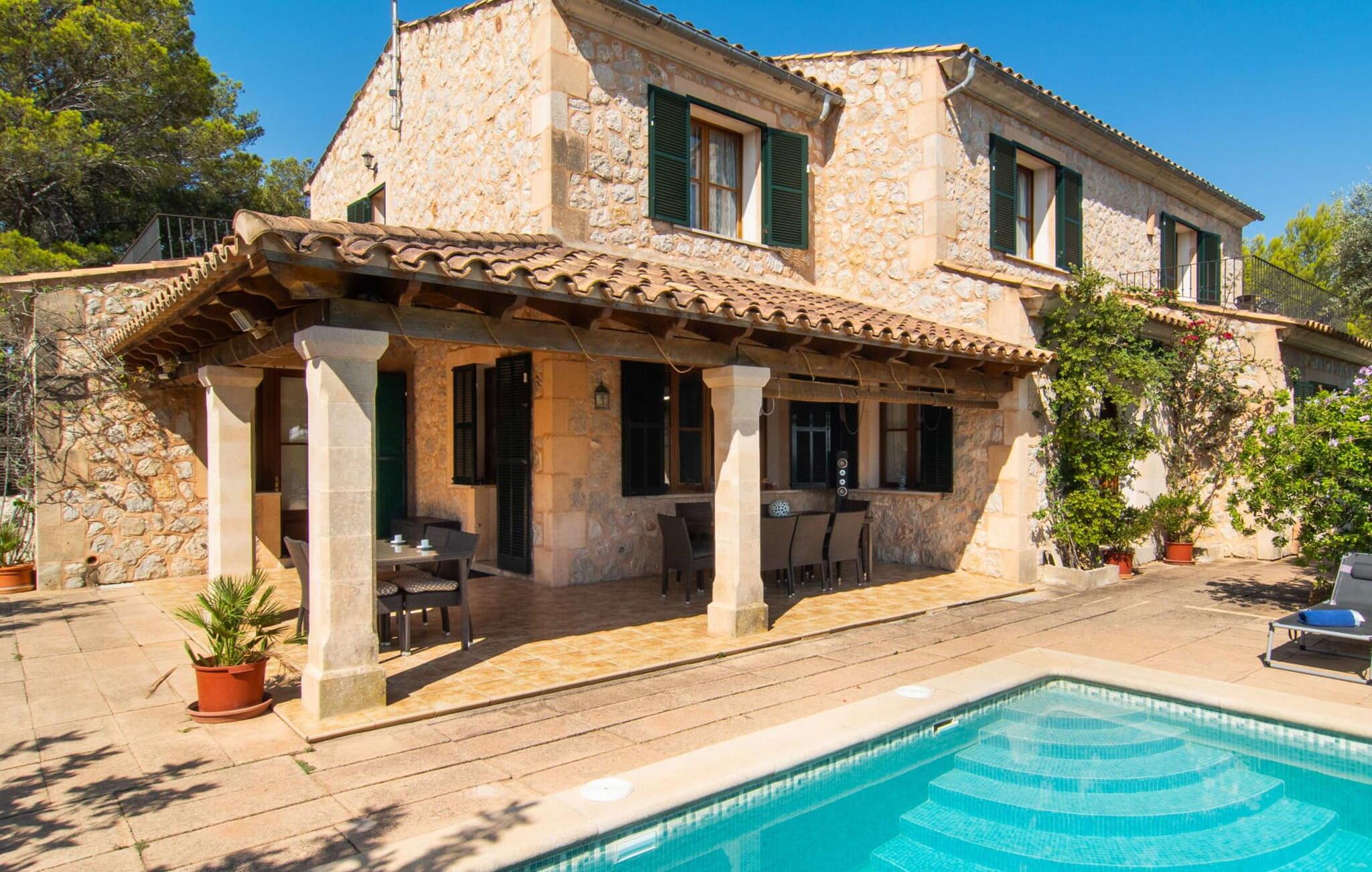 Sie erwarteten, einen Urlaub in einer wunderschönen mallorquinischen Villa zu verbringen, und mussten sich dann bei der Ankunft die Augen reiben. Dieses riesige Anwesen mit 74.000 m² einfach als Garten zu bezeichnen, wäre wohl eine der zehn größten Untertreibungen aller Zeiten. Bei einem so großen Grundstück müssen Sie keine neugierigen Blicke befürchten. Um es nicht zu sehr auf den Punkt zu bringen: Wenn Sie diese Villa mieten, werden Sie sich zu Recht wie ein Großgrundbesitzer fühlen. Der einzige Unterschied besteht darin, dass Sie nicht für die Instandhaltung des Ortes verantwortlich sind und somit genügend Zeit haben, die Vorzüge dieser Pool- und Terrassenlandschaft zu genießen. Wie es sich gehört, schimmert der Pool in einem rätselhaften und erfrischenden Türkis unter der Sonne. Aber die Chancen stehen gut, dass der Panoramablick auf das Tramuntana-Gebirge dieses zu einem der schönsten Badeerlebnisse Ihres Lebens macht. Letztendlich sind Sie hier der Herr des Anwesens und können entscheiden, wann der erste Cocktail des Tages serviert wird. Und wenn es Zeit ist, dem Hunger zu folgen und den Grill anzuwerfen. Natürlich können Sie auch auf einer der Sonnenliegen Platz nehmen oder, wenn Sie etwas mehr Höhe wünschen, auf dem Balkon im Obergeschoss einen Nachmittagstee genießen und gleichzeitig Postkarten an alle zu Hause schreiben, um zu erzählen, was für einen tollen Urlaub Sie haben .