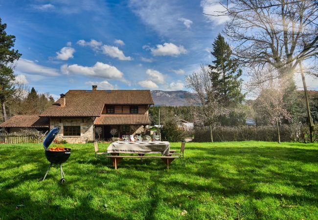 Die behagliche und geräumige Unterkunft mit 200 m², mit Blick auf die Berge und den Garten.