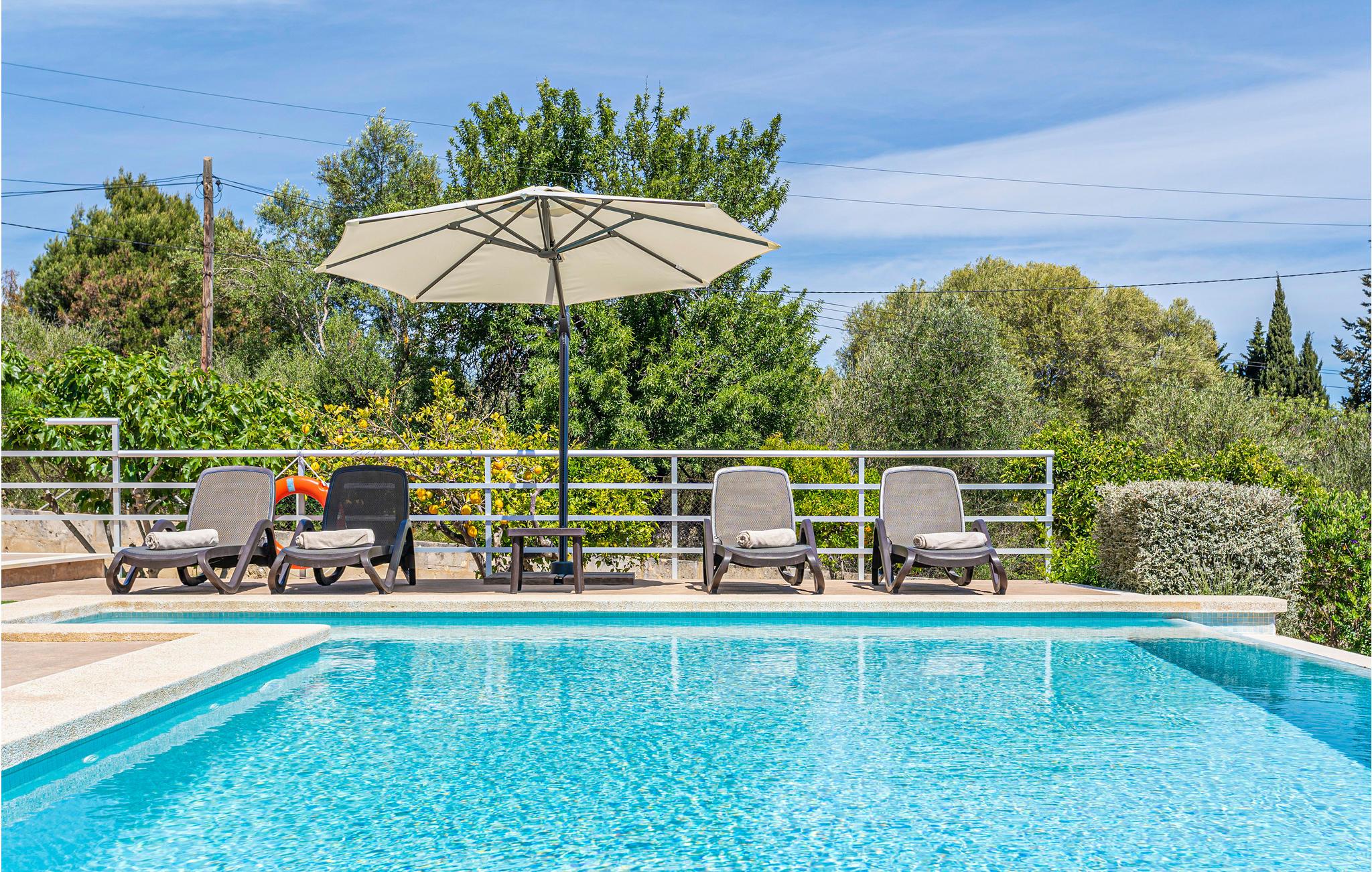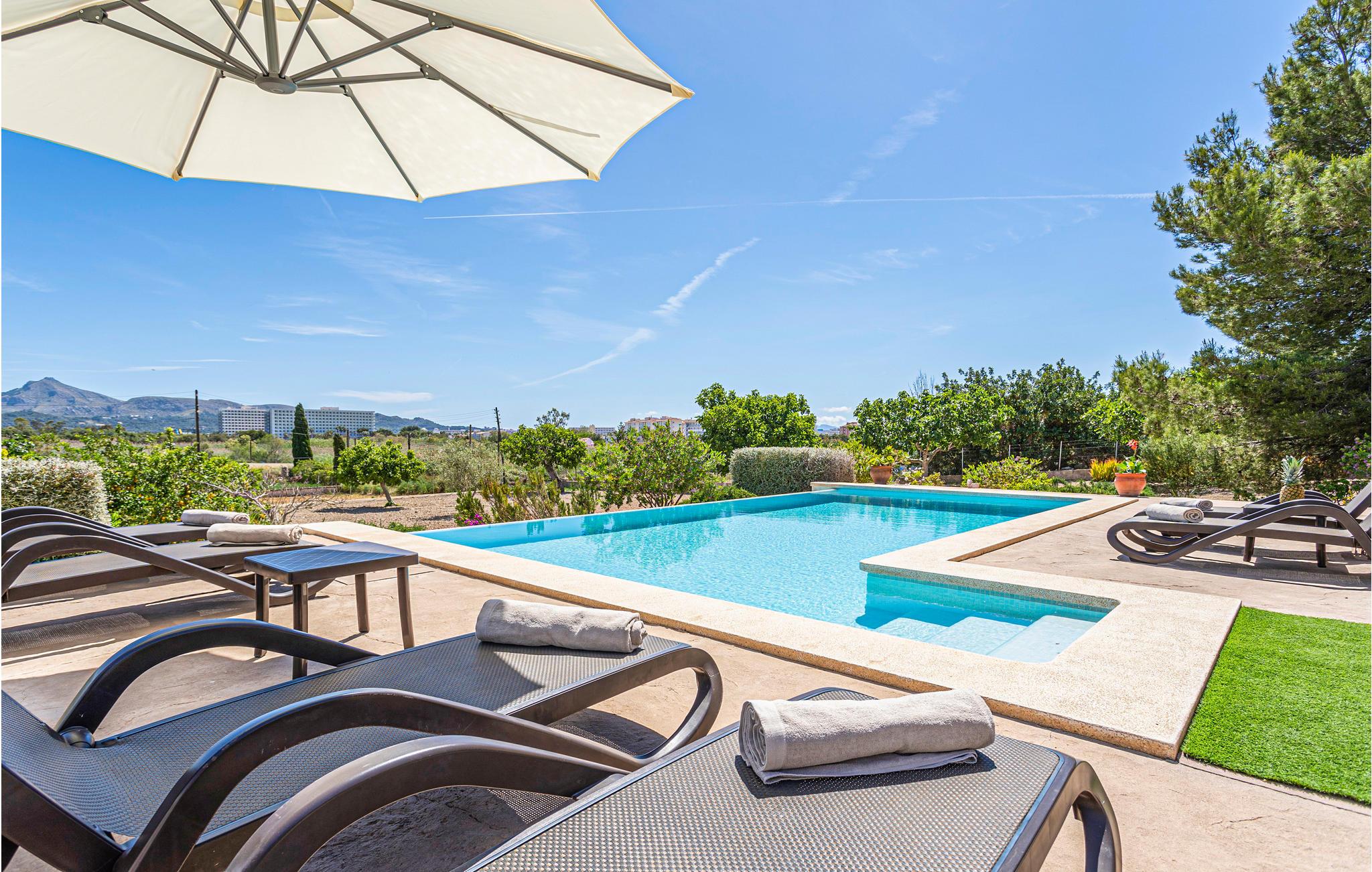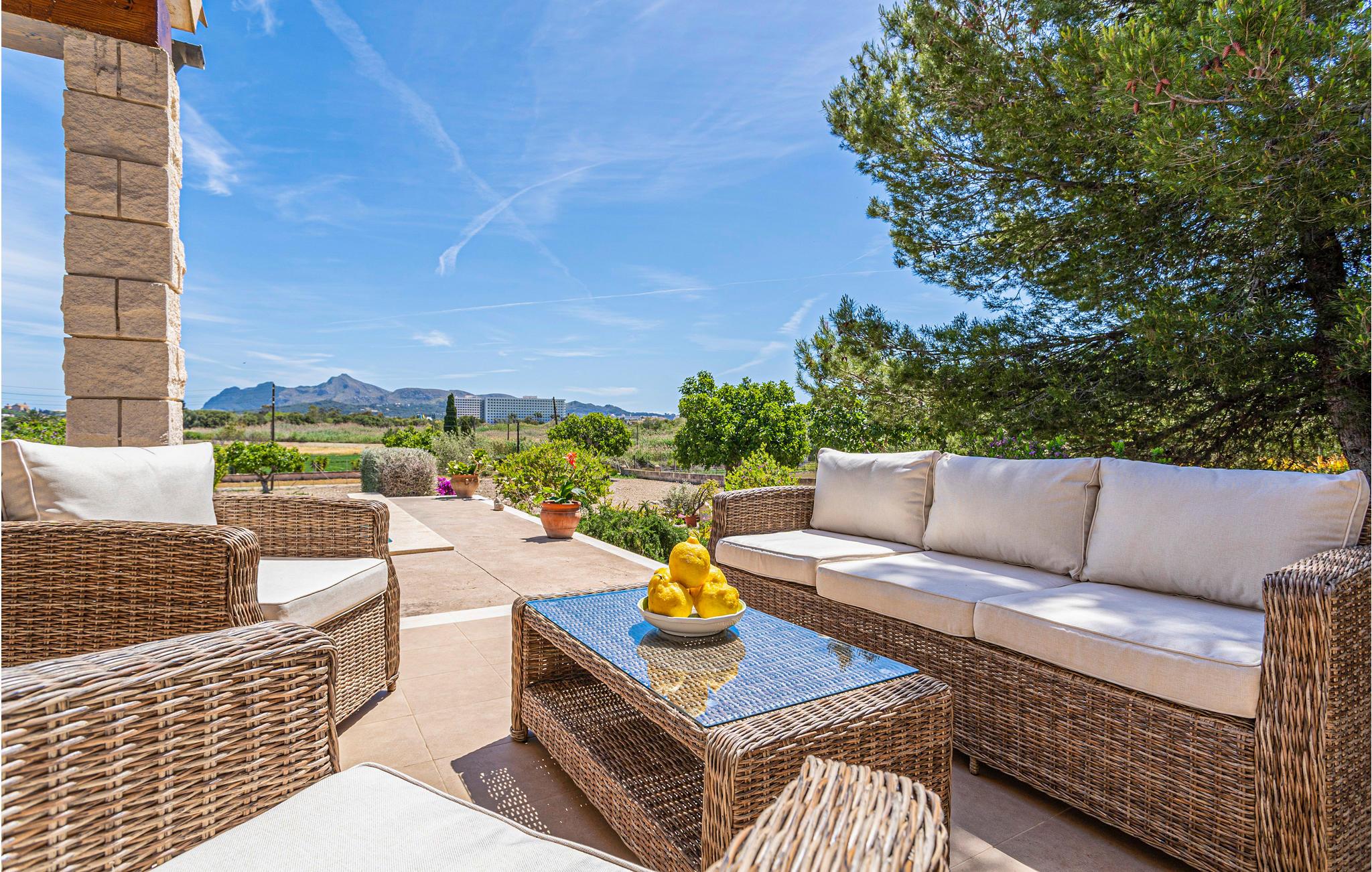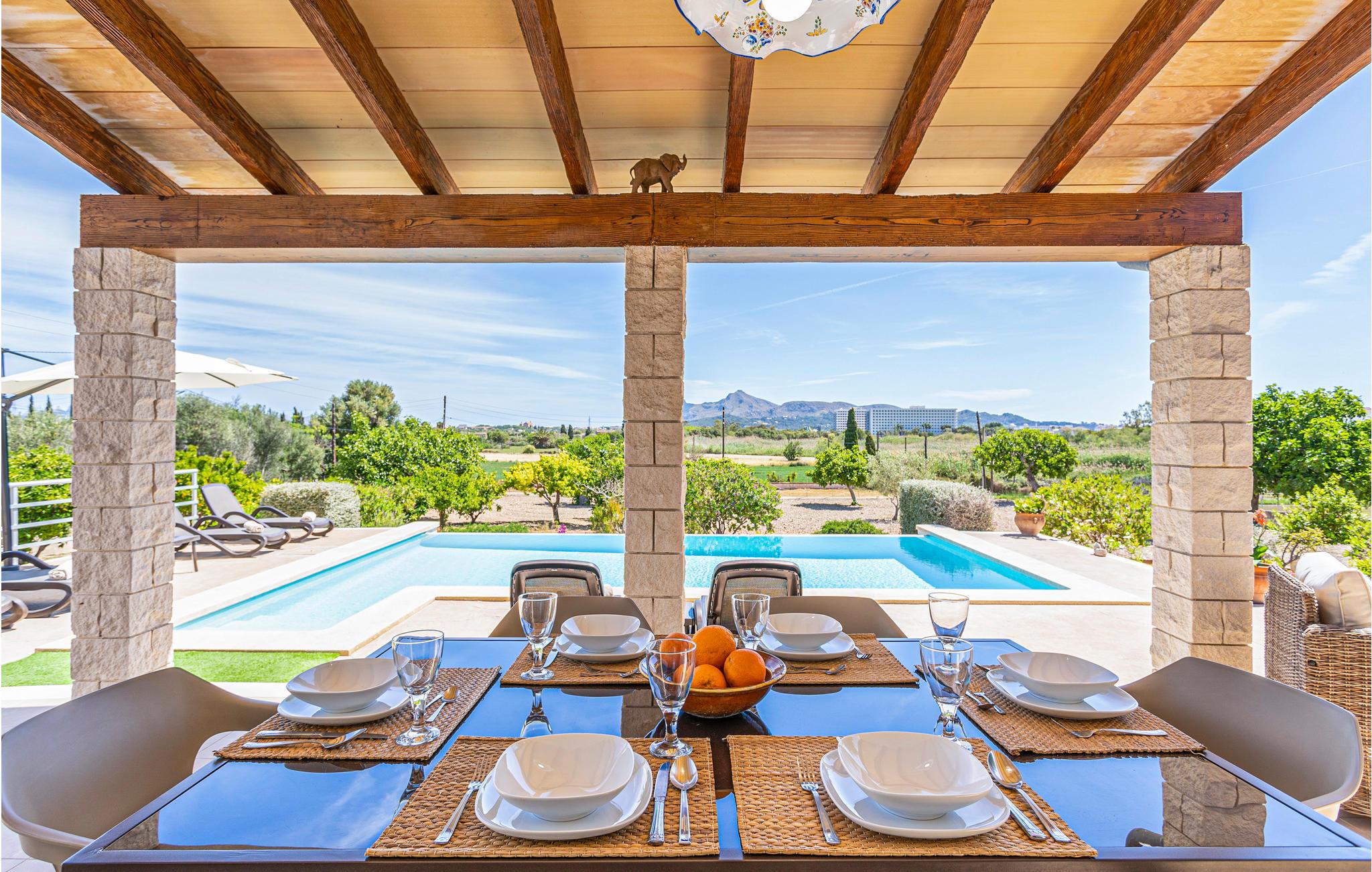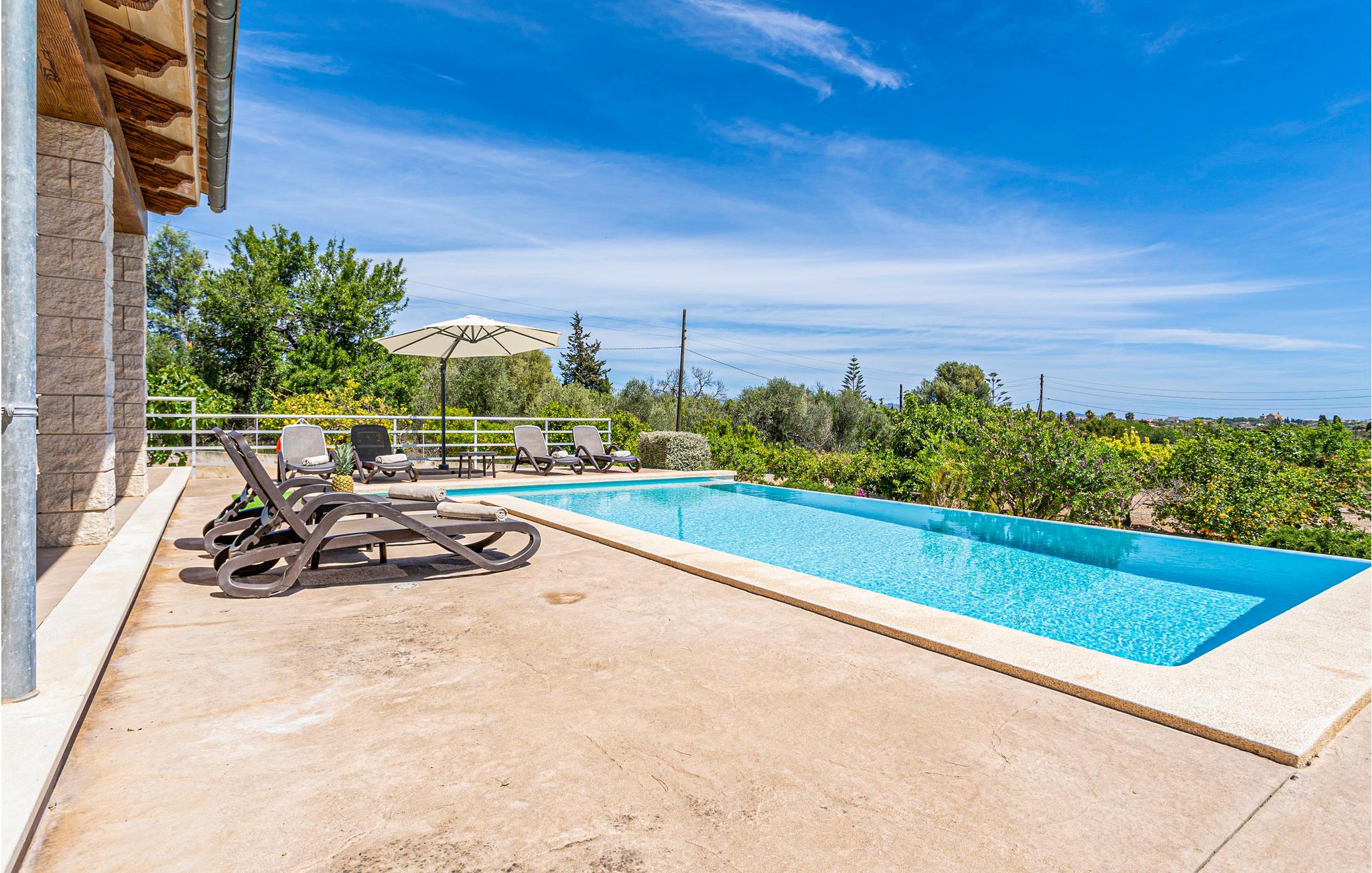 Eine praktische, ebenerdige Finca mit freier Sicht über die weiten Felder und auf die eindrucksvolle Bergkette der Tramuntana. Mit dieser schönen Weitsicht genießen Sie Ihre Mahlzeiten auf der gemütlichen Terrasse beim modernen Infinity-Pool. Dieser ist durch die schonende Osmose-Aufbereitung leicht salzhaltig und besonders hautfreundlich. Einer der längsten und schönsten Sandstrände der Insel liegt nur 2 km entfernt. Vorwiegend in der Hochsaison geht es dort recht quirlig zu und Sie finden viele Restaurants, Bars und Einkaufsmöglichkeiten. Der Eigentümer hält einige Hühner auf der Rückseite des Grundstücks. Gruppen (ausgenommen Familien und Pärchen ü30) auf Anfrage und mit Spezialkaution.