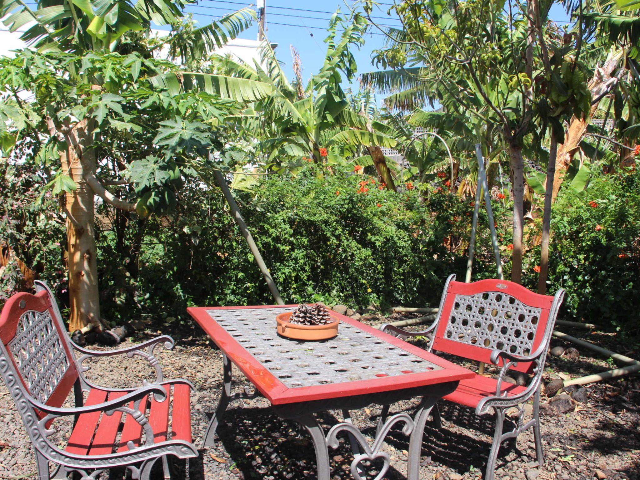 Die Terrasse wurde mit einem kleinen Tisch und 2 Korbstühlen möbliert. Hier kann man gemütlich frühstücken oder ein Buch lesen oder einfach die Ruhe genießen und dem Rauschen der Bananenpalmen zuhören.