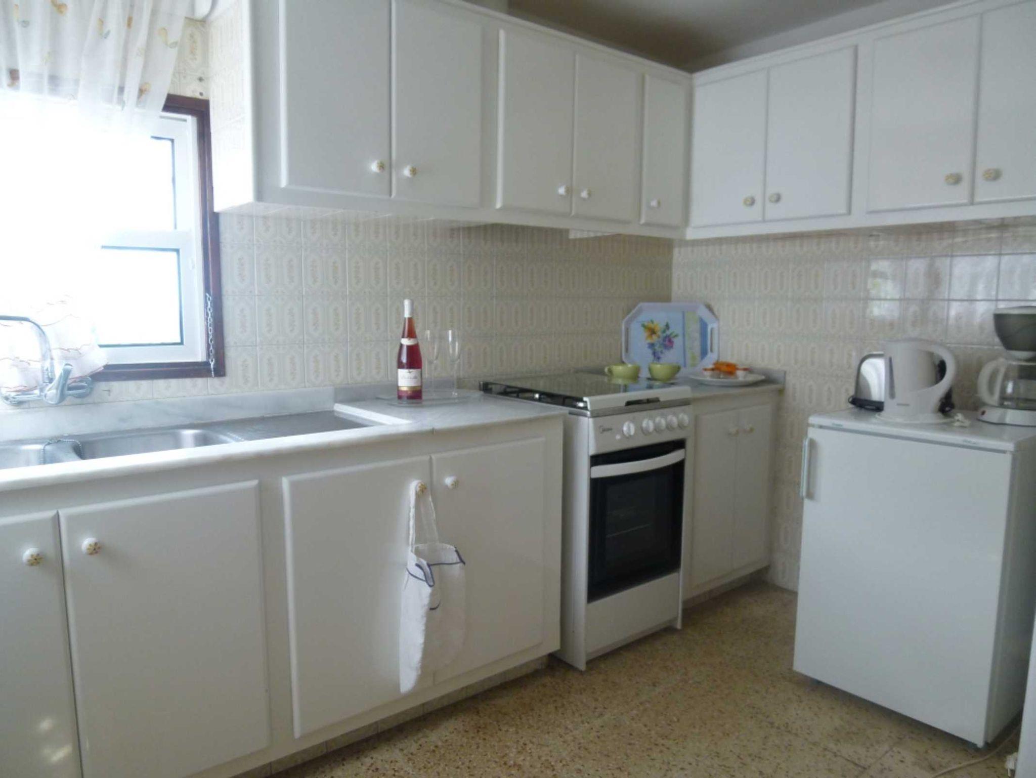 Man betritt das Haus durch die Wohnküche,in der 4 Personen Platz finden. Die gut ausgestattete Küche bietet neben viel Stauraum einen Gasherd mit 4 Platten sowie einen Backofen, einen Kühlschrank und gängige Elektrogeräte. Vom Essbereich aus gelangt man direkt in den Garten.