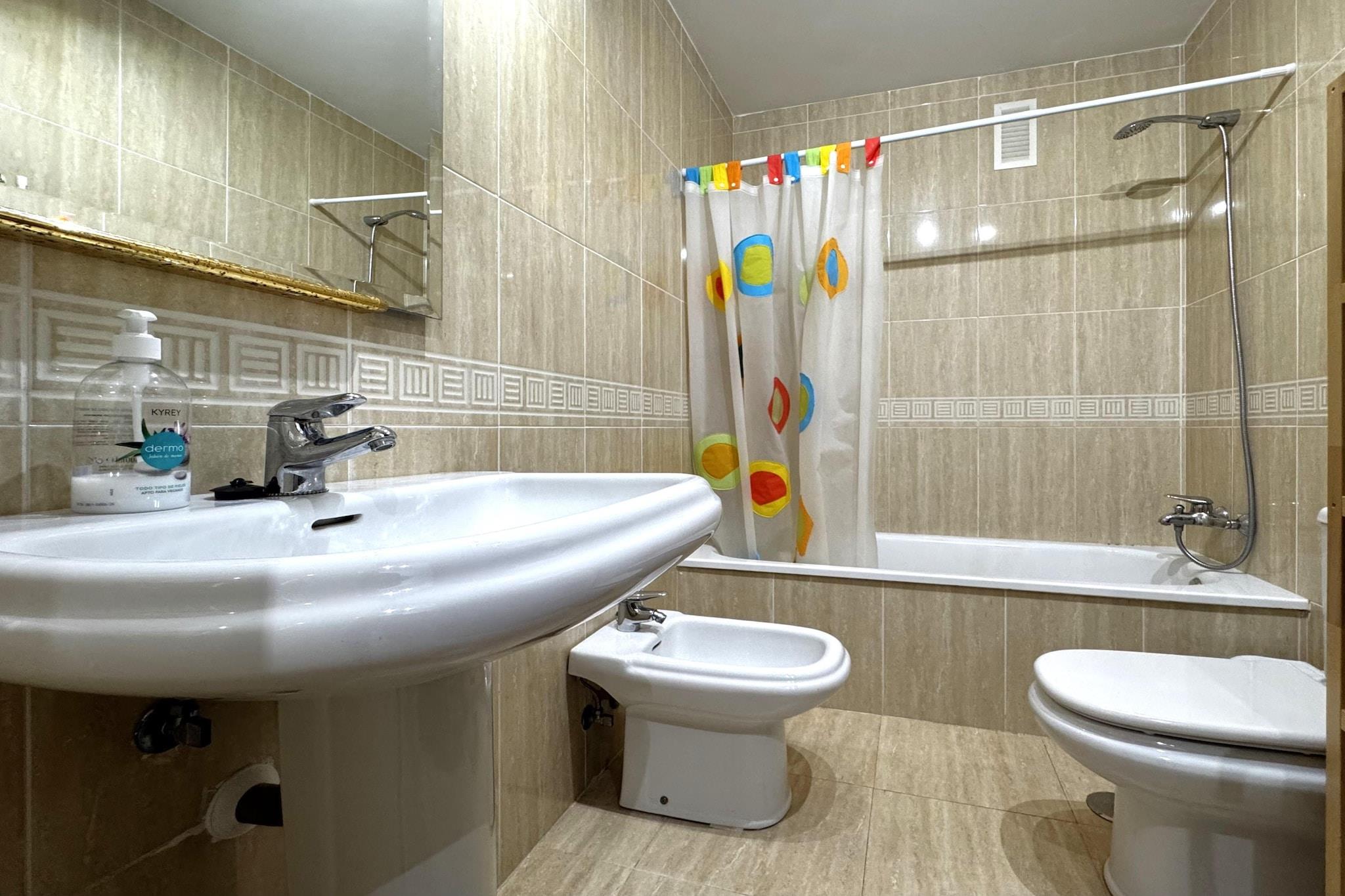 Dieses helle Apartment, das mit dem Aufzug vom Erdgeschoss in die erstklassige Lage im 3. Stock gelangt, bietet einen komfortablen und stilvollen Aufenthalt. Betreten Sie den durchdacht gestalteten Wohn- und Essbereich mit gemütlicher Sitzecke, Flachbildfernseher und Esstisch - ideal für gemeinsame Mahlzeiten. Die Klimaanlage sorgt für Komfort zu jeder Jahreszeit. Die moderne Küche ist komplett ausgestattet: Herd, Wasserkocher, Toaster, Dunstabzugshaube, Kaffeemaschine, Backofen, Mikrowelle, Geschirrspüler und ein geräumiger Kühl-Gefrierschrank - sogar Weingläser für Ihren Genuss sind vorhanden. Das Apartment bietet Platz für Ihre Gruppe in drei gut ausgestatteten Schlafzimmern. Das erste Schlafzimmer verfügt über ein bequemes Doppelbett, das zweite über ein gemütliches Etagenbett für drei Personen - ideal für Kinder oder zusätzliche Gäste. Das dritte Schlafzimmer bietet flexible Schlafmöglichkeiten mit einem Doppelbett oder zwei Einzelbetten. Zwei Badezimmer sorgen für zusätzlichen Komfort: eines mit Badewanne und Dusche, das andere mit einer erfrischenden Dusche. Ein separater Waschraum mit Waschmaschine, Bügelbrett und Bügeleisen sorgt für Ihre Wäsche. Betreten Sie Ihre private Terrasse - ein perfekter Ort zum Entspannen und Genießen der frischen Luft. Das Apartment verfügt über eine Luft-Luft-Wärmepumpe, die für effizientes Heizen und Kühlen sorgt. Dieses gut ausgestattete und strategisch gelegene Apartment verspricht ein angenehmes und angenehmes Erlebnis und bietet allen Komfort eines Zuhauses in einer praktischen Umgebung.