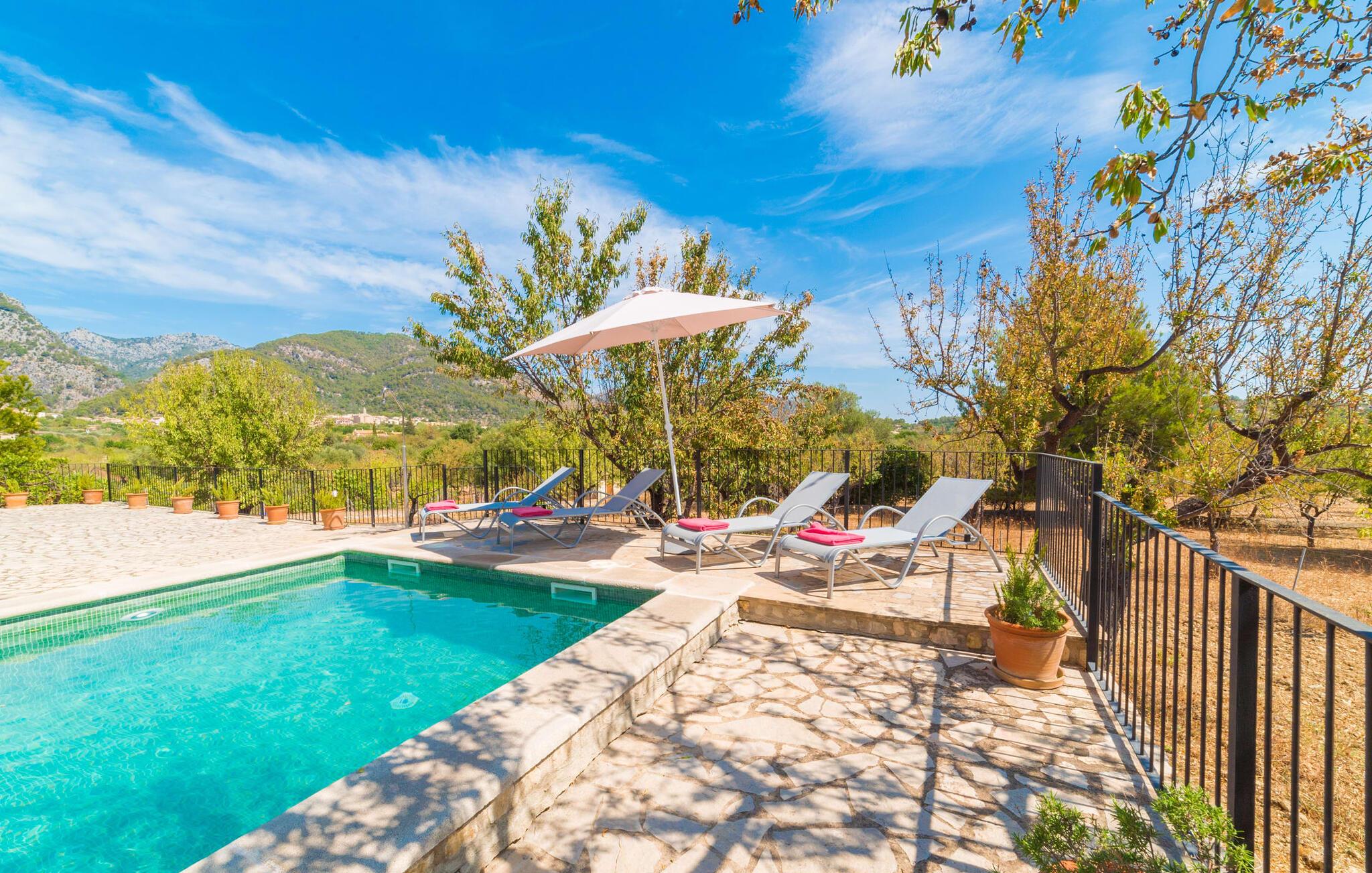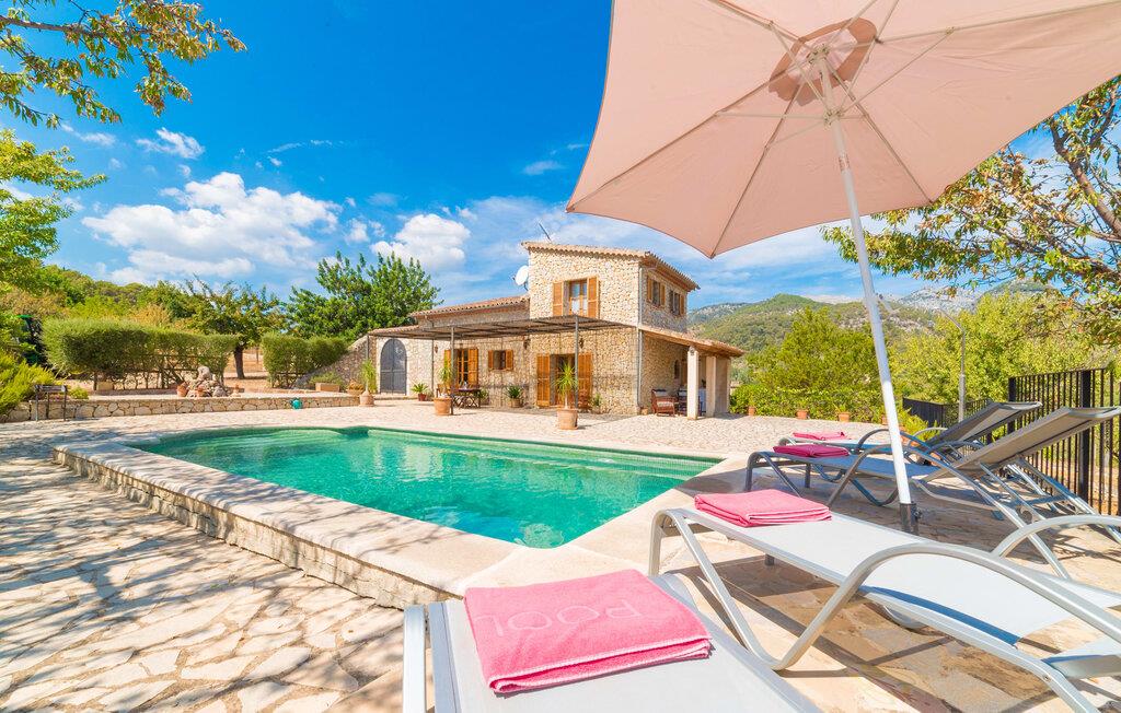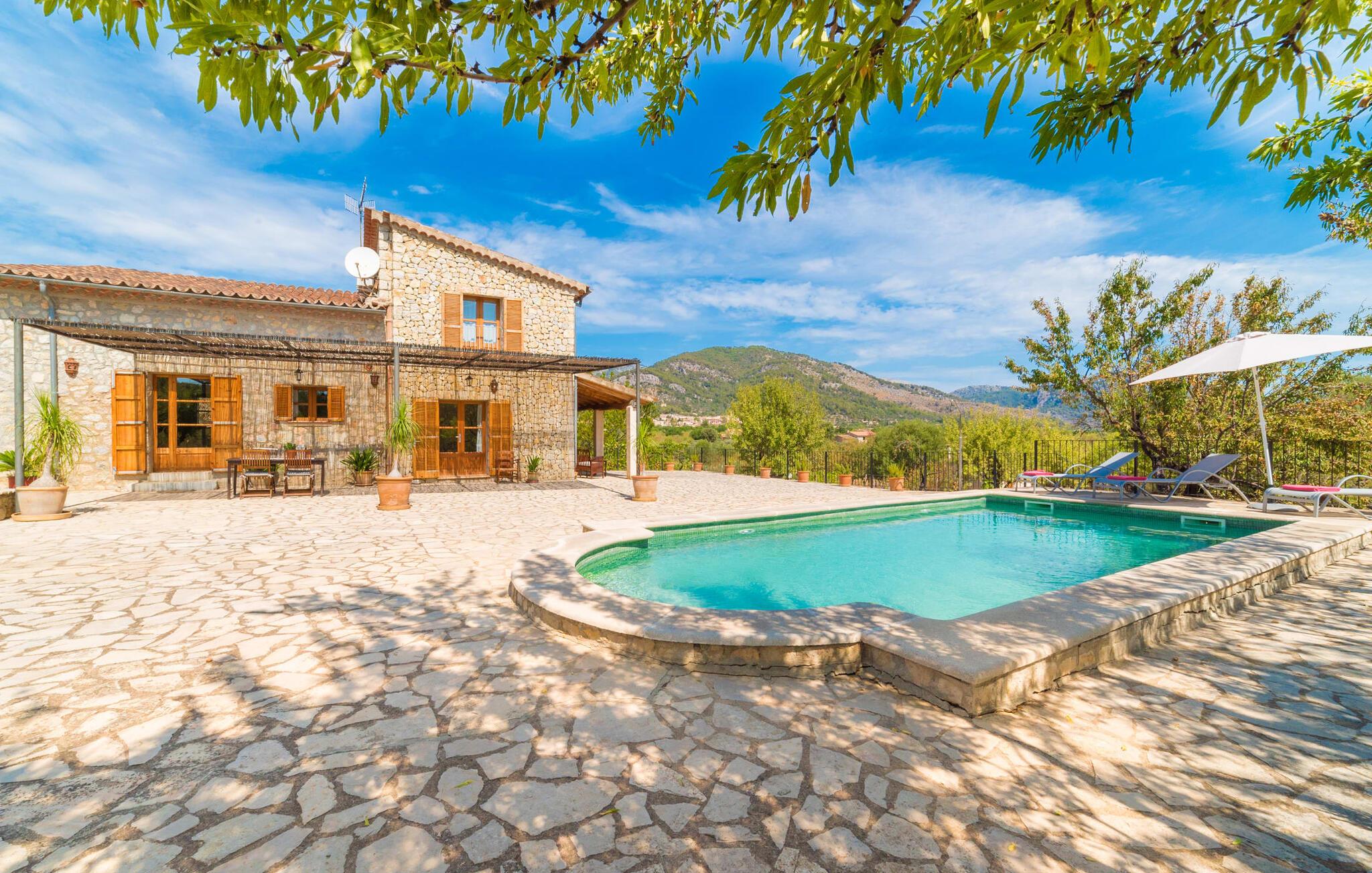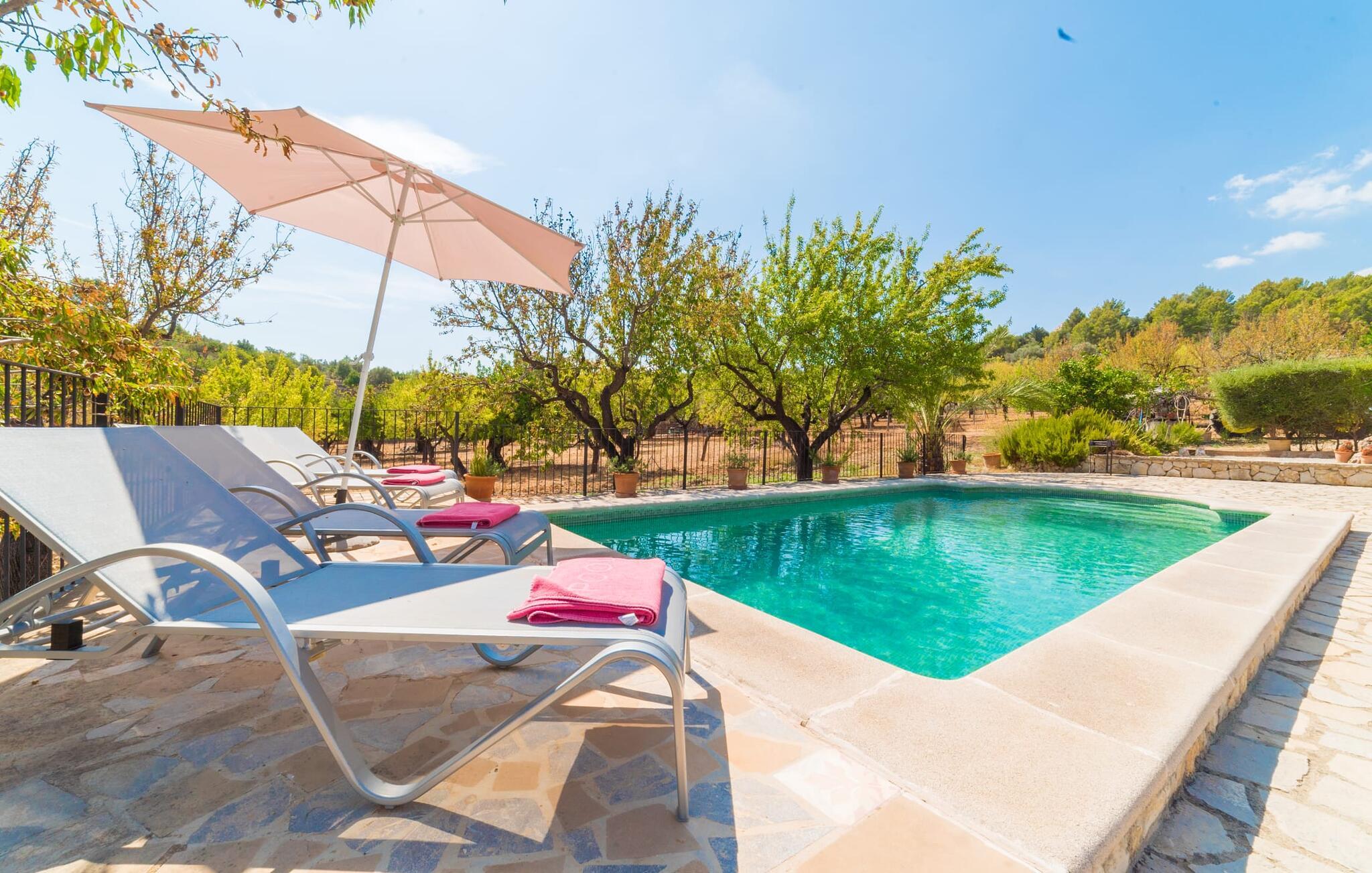 In herrlich ländlicher Idylle und umgeben von bezauberndem mediterranem Charme empfängt die Natursteinvilla „Sa Volta“ ihre Gäste. Diese außerordentlich freundliche Atmosphäre macht bei Neuankömmlingen sofort Lust zum Bleiben. Der Außenbereich dieses Ferienhauses ist geprägt von weitläufigen, mit Natursteinen gefliesten Terrassenflächen sowie viel Grün, das dieses malerische Bild dekorativ umrahmt. Der Pool als zentrales Element des Außenbereichs ist mit seinen grün schimmernden Mosaikfliesen ein echter Hingucker. Es hat eine Tiefe von bis zu 2,10 m und ist sehr bequem über eine Treppe erreichbar. Im kühlenden Nass kann man sich an warmen Tagen wunderbar erfrischen – und anschließend auf den bereitgestellten Liegen in der Sonne entspannen und vielleicht mal gar nichts tun. Schließlich sind Sie im Urlaub. Der mitgelieferte Sonnenschirm schützt Sie vor übermäßiger UV-Strahlung. Das Haus bietet weitere attraktive Sitzmöglichkeiten von sonnig über halbschattig bis schattig. Mit insgesamt sieben Sitzmöglichkeiten im Freien gibt es jede Menge Abwechslung und jeder findet seinen persönlichen Lieblingsplatz. Die Terrasse am Haus ist ein schöner Ort, um Ihre Mahlzeiten gemeinsam zu genießen. Je nach Tageszeit bietet dieser Ort unterschiedliche Ausblicke, die sich mit dem Sonnenstand ändern. Jedes davon hat seinen ganz eigenen Reiz und wird Ihnen stundenlange Freude bereiten.