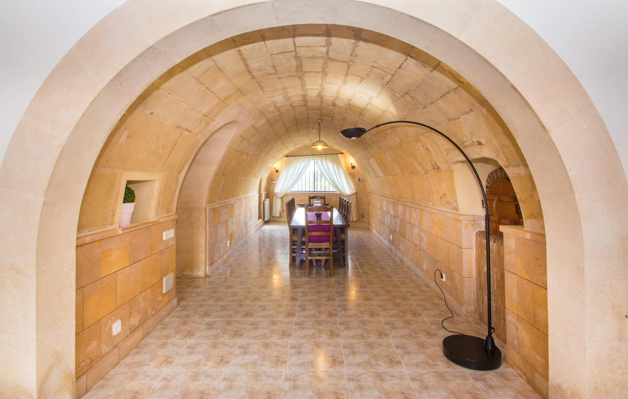 Sobald Sie Ihre Villa „Sant Blai Nou“ nach einer 40-minütigen Fahrt von Palma aus erreicht haben, werden Sie von der Größe des Anwesens staunen: Mit einer unglaublichen Fläche von 12.474 m² kommen Sie mit Sicherheit nicht in jedes hinein Andersherum, auch wenn Sie zu neunt im Haus wohnen. Beeindruckend sind auch die Abmessungen des 12 x 6 m großen Pools, sodass Sie bei Sonnenaufgang mit ein paar Bahnen schwimmend in den Tag starten können. Ein Teil der den Pool umgebenden Terrasse ist mit Kunstrasen bedeckt – hier können Sie es sich auf bequemen Liegen gemütlich machen und die reichliche Sonne der Insel genießen. Dank der guten Infrastruktur des Außenbereichs – neben einem Außenbad finden Sie auch eine überdachte Außenküche – können Sie problemlos die meiste Zeit an der frischen Luft verbringen. Und genießen Sie unvergessliche Grillabende bis spät in die Nacht. Die Alleinlage gewährleistet ein hohes Maß an Privatsphäre. Eine hohe Palme dominiert den Vorplatz der Villa – hier finden Sie auch ein Relikt aus einer Zeit, als Pferde für die Landwirtschaft auf der Insel noch unverzichtbar waren.