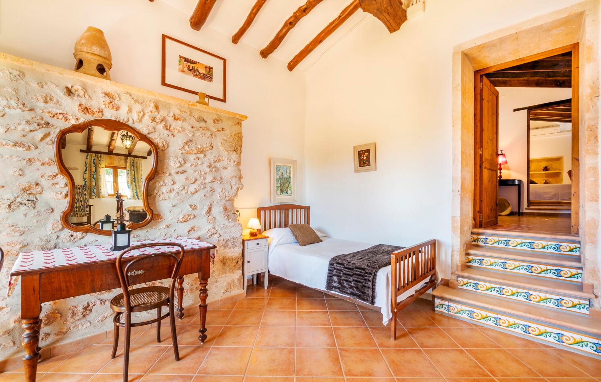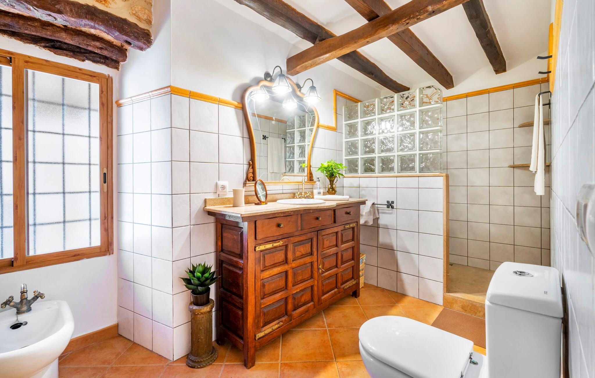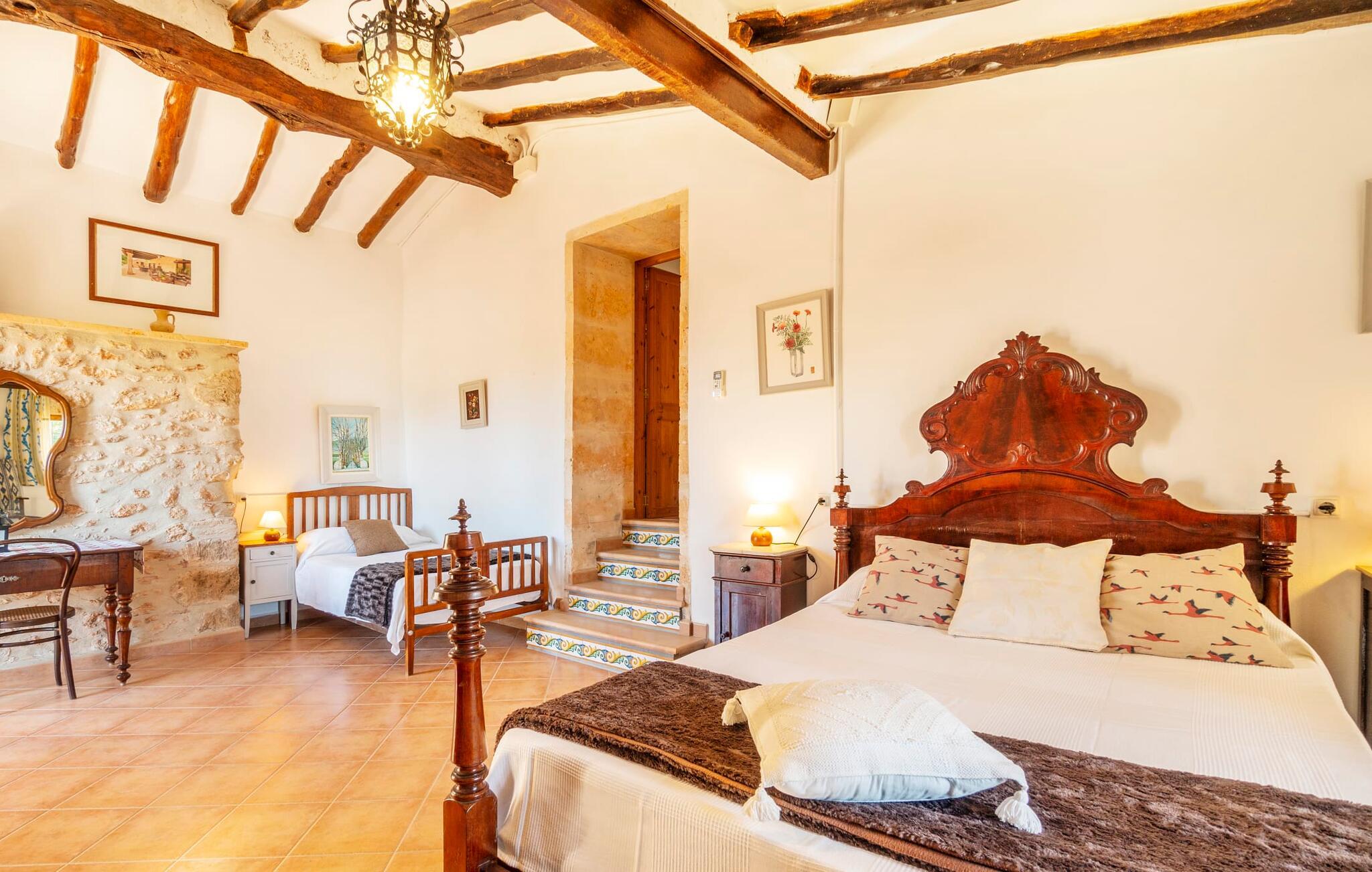 Das Haus selbst ist wie folgt aufgeteilt: Im Erdgeschoss gibt es einen atemberaubenden Eingangsbereich, eine geräumige Küche mit Esstisch, ein Fernsehzimmer und ein Badezimmer. Es gibt auch eine Treppe, die in den Keller führt. Im Obergeschoss befinden sich die vier Schlafzimmer und zwei Badezimmer. Eines davon ist von außen zugänglich, sodass Sie vom Schlafzimmer aus über den Balkon ins Badezimmer gelangen. Das Innere der Villa „Son Gabriela“ wurde im typisch mallorquinischen Stil gestaltet, was dem Anwesen eine besonders urige Atmosphäre verleiht. Im gesamten Anwesen werden Sie auf eine Fülle wunderschöner, echter antiker Möbel stoßen, die perfekt mit den farbenfrohen Wänden, den freiliegenden Balken und den Terrakottafliesen harmonieren. Hier und da sind dekorative Natursteinelemente zu sehen. Eine Vielzahl unterschiedlicher Wohnbereiche machen es Ihnen allen leicht, sich nach Herzenslust auszubreiten und mindestens einen der vielen einladenden Plätze zu finden, die zum ausgiebigen Entspannen einladen. Die gemütliche Küche ist bestens für den täglichen Bedarf ausgestattet und bietet vom Wasserkocher bis zur Filterkaffeemaschine alles. Für kühle Abende gibt es sogar einen Kamin, an dem Sie gemeinsam am Esstisch sitzen und eine Mahlzeit genießen können. In spektakulär schönen Schlafzimmern findet jeder einen Platz zum Ausruhen, der genau seinen Wünschen entspricht. Auch hier finden wir antikes Flair und ein absolut charmantes Arrangement. Die Badezimmer sind in einem modernen und sehr geschmackvollen Stil eingerichtet. Das Mitbringen eines eigenen Bügeleisens und Haartrockners ist nicht erforderlich, da diese bereits vor Ort vorhanden sind und während Ihres Urlaubs kostenfrei genutzt werden können. Im Keller können Sie Ihre Lebensmittel bequem gekühlt aufbewahren.