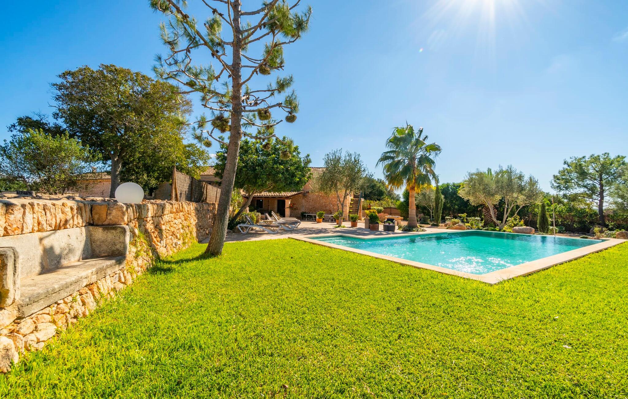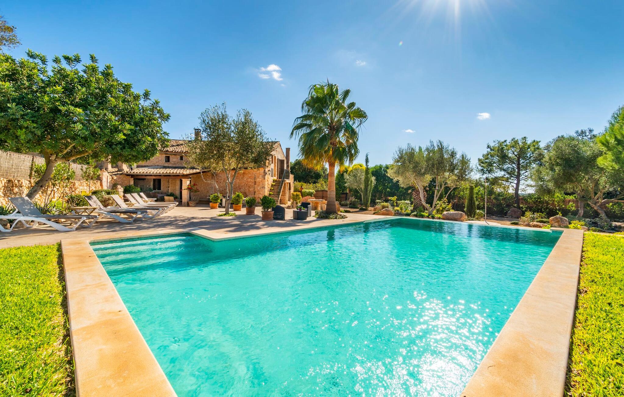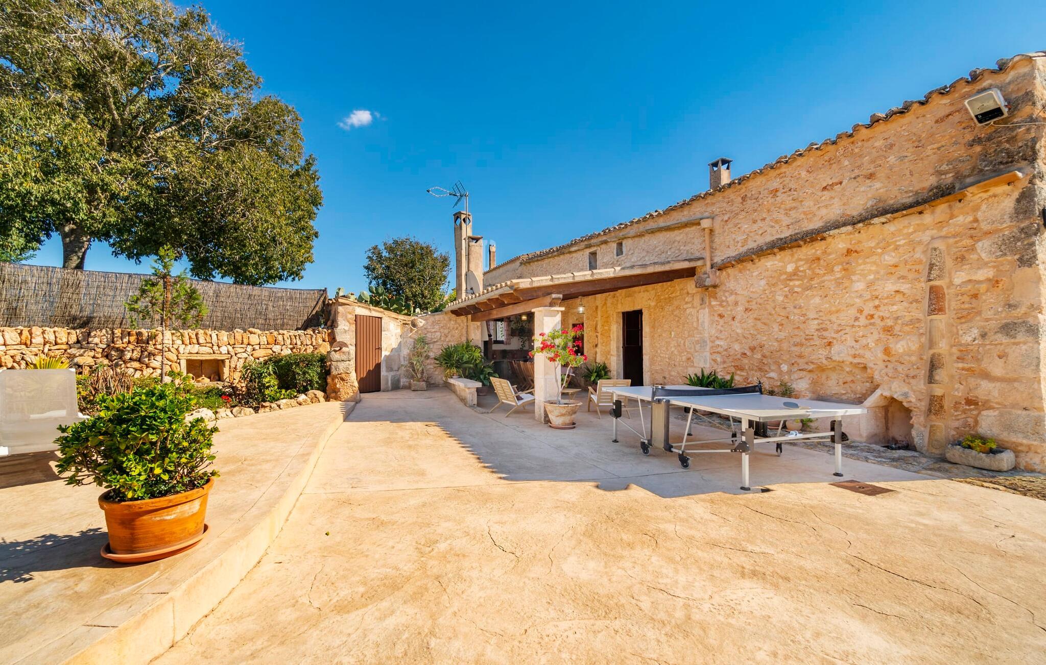 Die gut versteckte Villa „Son Gabriela“ empfängt ihre Gäste in einer völlig ländlichen Atmosphäre und mit einer unglaublichen Ruhe, die das Anwesen umgibt. Im weitläufigen Garten, der größtenteils mit hellem Sandsteinkies bedeckt ist, werden sich auch Neulinge sofort wohlfühlen und die Lust zum Bleiben überkommen. Eine kleine Rasenfläche neben dem Pool sorgt für ein interessantes und abwechslungsreiches Gesamtbild und bietet einen malerischen Spielbereich für eventuell mitreisende Kinder. Zwischen dem Haus und dem Pool gibt es Terrassen, die jeweils über zahlreiche hübsche Sitzbereiche verfügen, auf denen Sie unter freiem Himmel entspannen können. Besonders elegant und einladend sind die Sitzgelegenheiten, die direkt in die kleinen Natursteinmauern eingebaut wurden. Hier lässt es sich wunderbar die Zeit vertreiben und dabei den Blick auf den Garten schweifen lassen. Direkt neben dem Haus befindet sich die überdachte Terrasse, die dank ihres großen Esstisches den perfekten Rahmen für gemeinsames Essen bietet. Auch hier wurde praktischerweise ein eingebauter Grill eingebaut, so dass Sie die Köstlichkeiten der Region frisch zubereiten und genießen können. Ein stilvoller Doppelpool, dekoriert mit türkisfarbenen Mosaikfliesen, ist für Jung und Alt ein echter Hingucker. Hier können Sie sich abkühlen und an warmen Tagen eine angenehme Erfrischung finden. Der große Pool ist bequem über eine breite Treppe erreichbar und hat eine maximale Tiefe von 1,90 m. Rund um das Anwesen selbst gibt es so viel Privatgrundstück, dass jeder, der dieses Anwesen mietet, praktisch einen Spaziergang machen kann, ohne sich auch nur aus seinem eigenen kleinen Bereich herauszuwagen. Bei dieser Immobilie wohnen Sie sozusagen in einer Doppelhaushälfte. Der andere Teil des Hauses ist jedoch unbewohnt, sodass Sie Ihren Urlaub in absoluter Privatsphäre genießen können. Das Haus verfügt über einen eigenen Parkplatz, der etwa 20 m vom Grundstück entfernt liegt.