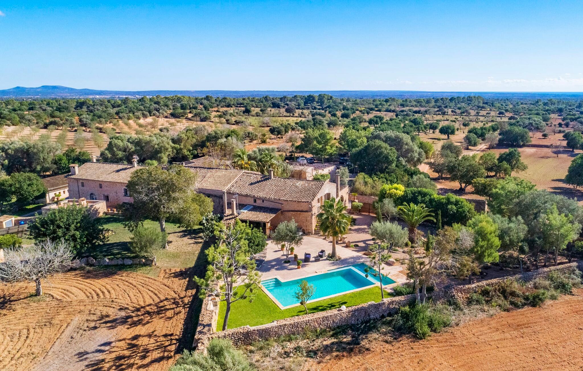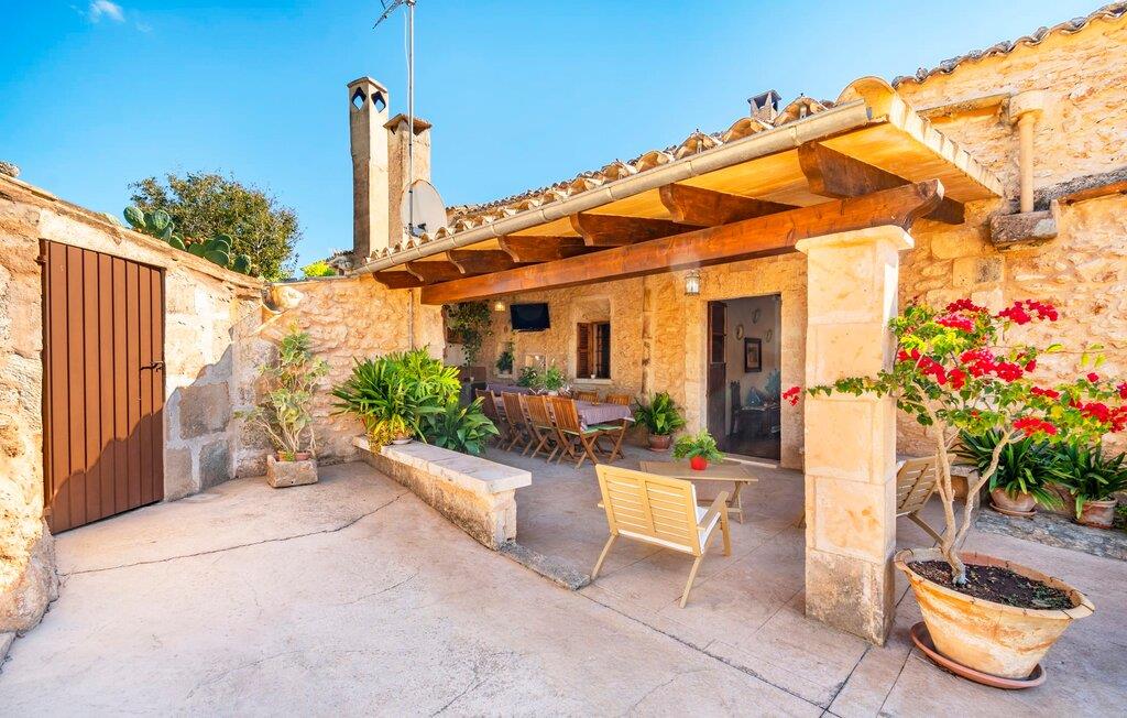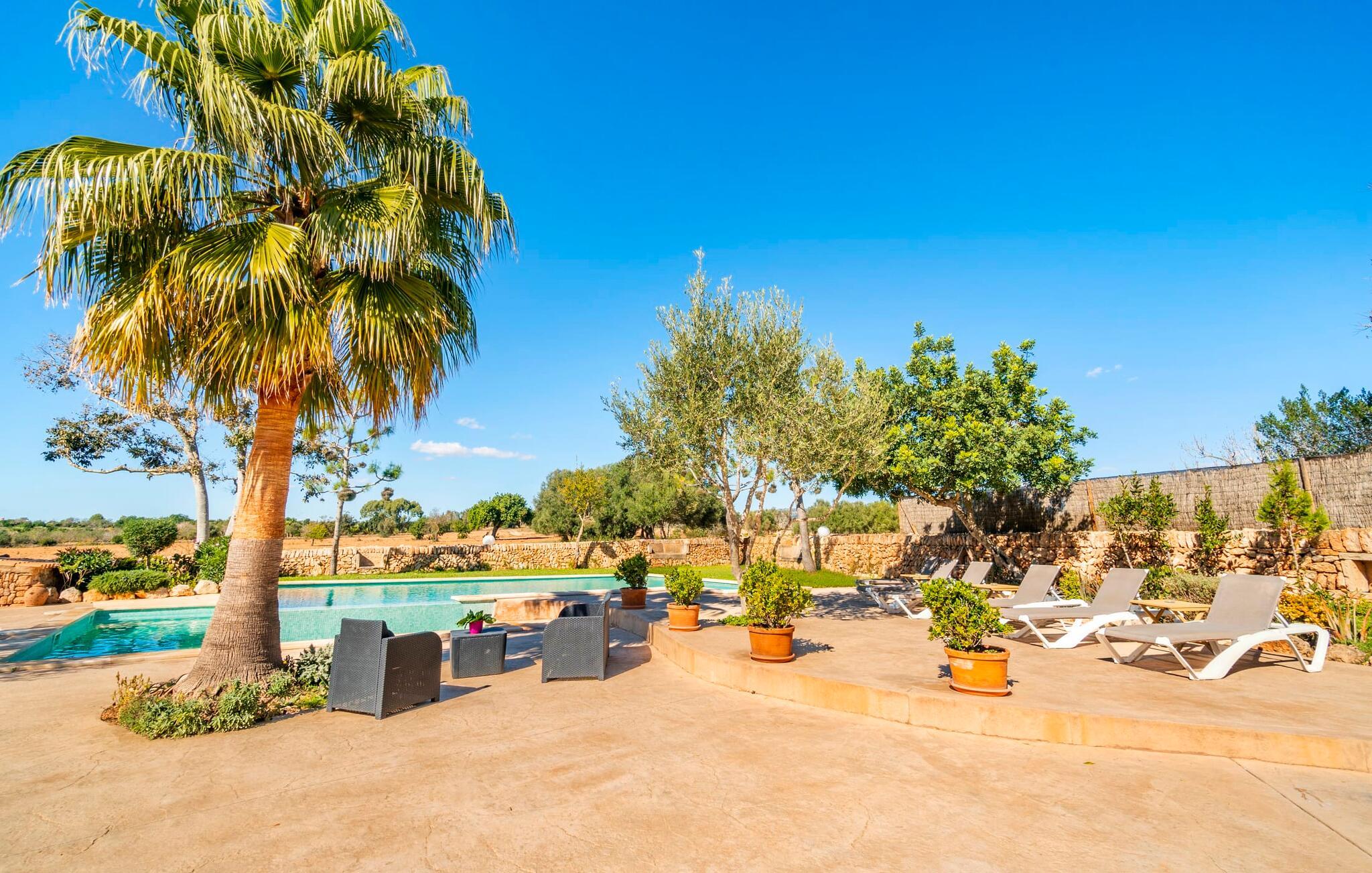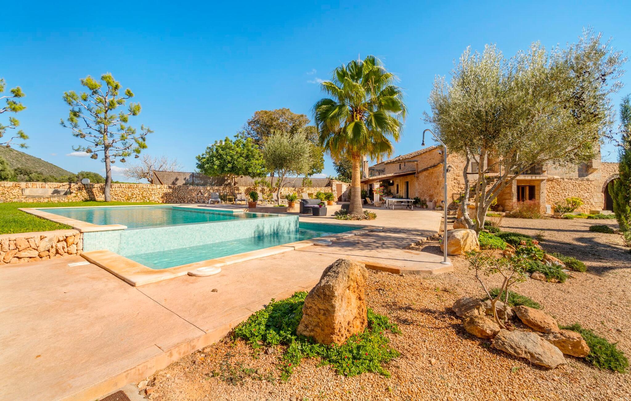 Die gut versteckte Villa „Son Gabriela“ empfängt ihre Gäste in einer völlig ländlichen Atmosphäre und mit einer unglaublichen Ruhe, die das Anwesen umgibt. Im weitläufigen Garten, der größtenteils mit hellem Sandsteinkies bedeckt ist, werden sich auch Neulinge sofort wohlfühlen und die Lust zum Bleiben überkommen. Eine kleine Rasenfläche neben dem Pool sorgt für ein interessantes und abwechslungsreiches Gesamtbild und bietet einen malerischen Spielbereich für eventuell mitreisende Kinder. Zwischen dem Haus und dem Pool gibt es Terrassen, die jeweils über zahlreiche hübsche Sitzbereiche verfügen, auf denen Sie unter freiem Himmel entspannen können. Besonders elegant und einladend sind die Sitzgelegenheiten, die direkt in die kleinen Natursteinmauern eingebaut wurden. Hier lässt es sich wunderbar die Zeit vertreiben und dabei den Blick auf den Garten schweifen lassen. Direkt neben dem Haus befindet sich die überdachte Terrasse, die dank ihres großen Esstisches den perfekten Rahmen für gemeinsames Essen bietet. Auch hier wurde praktischerweise ein eingebauter Grill eingebaut, so dass Sie die Köstlichkeiten der Region frisch zubereiten und genießen können. Ein stilvoller Doppelpool, dekoriert mit türkisfarbenen Mosaikfliesen, ist für Jung und Alt ein echter Hingucker. Hier können Sie sich abkühlen und an warmen Tagen eine angenehme Erfrischung finden. Der große Pool ist bequem über eine breite Treppe erreichbar und hat eine maximale Tiefe von 1,90 m. Rund um das Anwesen selbst gibt es so viel Privatgrundstück, dass jeder, der dieses Anwesen mietet, praktisch einen Spaziergang machen kann, ohne sich auch nur aus seinem eigenen kleinen Bereich herauszuwagen. Bei dieser Immobilie wohnen Sie sozusagen in einer Doppelhaushälfte. Der andere Teil des Hauses ist jedoch unbewohnt, sodass Sie Ihren Urlaub in absoluter Privatsphäre genießen können. Das Haus verfügt über einen eigenen Parkplatz, der etwa 20 m vom Grundstück entfernt liegt.
