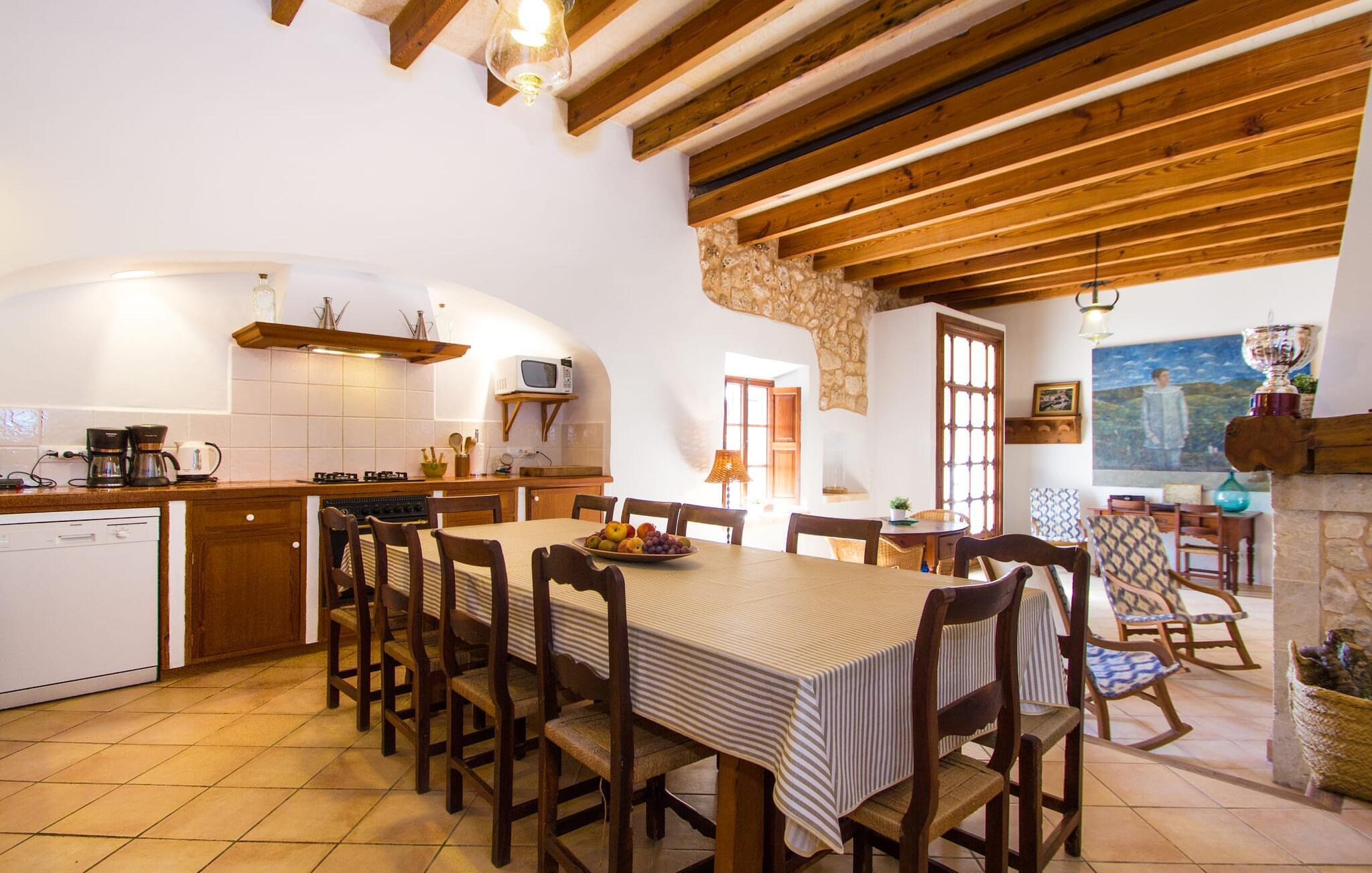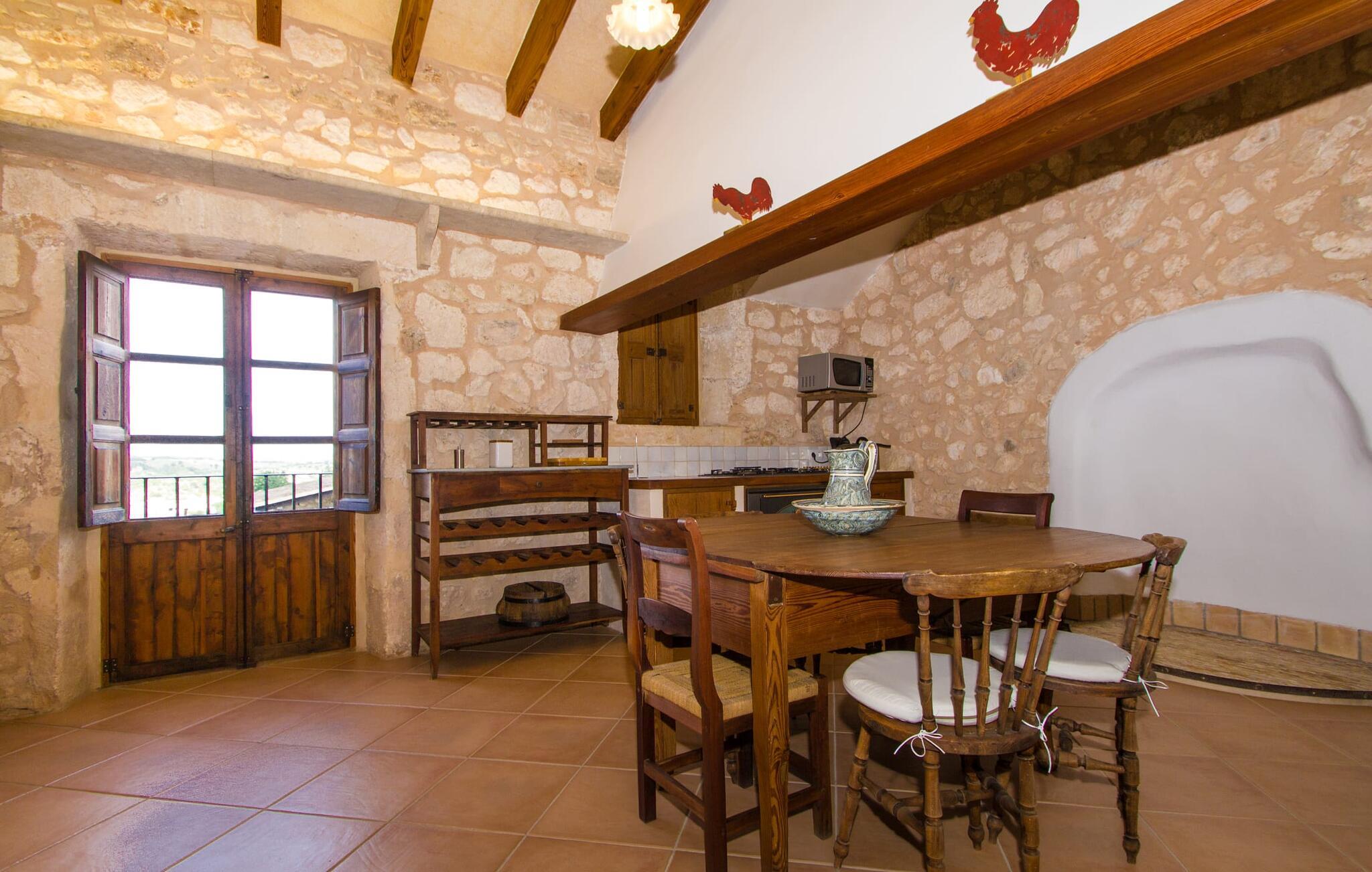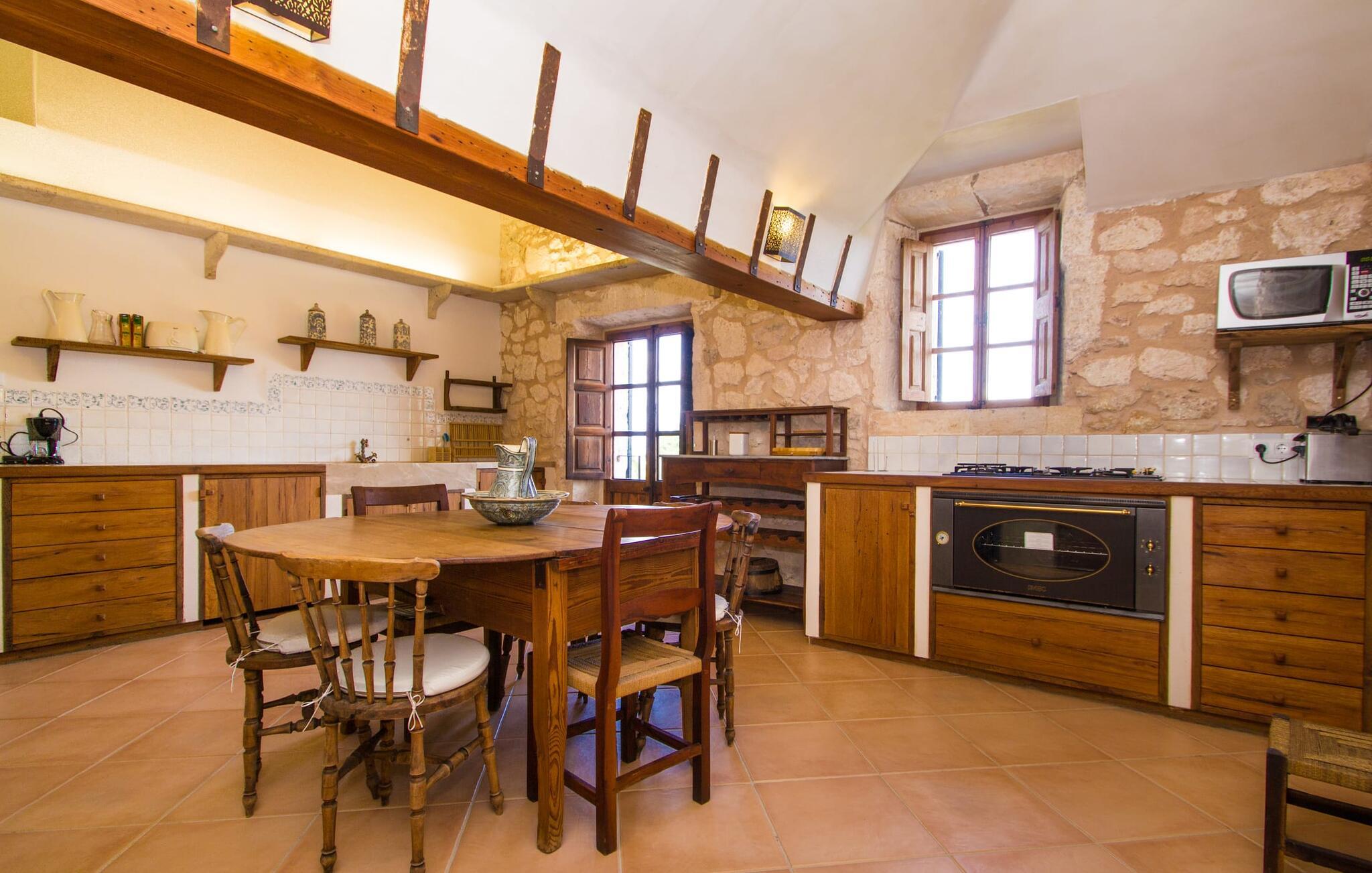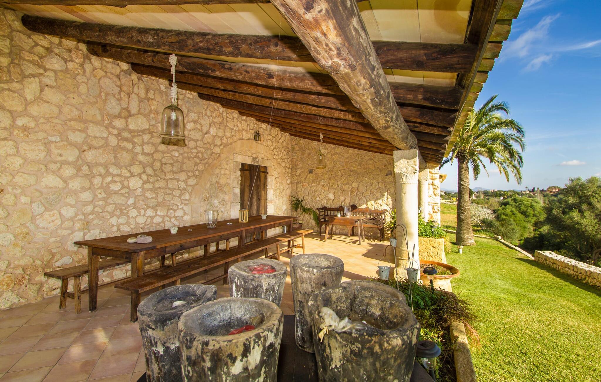 Im „Son Mas Vell“ gelingt das ganz einfach. Wenn Sie von einem Bali-Bett am Pool aus in den sternenklaren Nachthimmel blicken, werden Sie sich fühlen, als wären Sie König oder Königin von allem, was Sie überblicken. Suchen Sie sich einen Ort zum Entspannen aus – die Möglichkeiten rund um den extragroßen Swimmingpool sind wie aus einem romantischen Märchen. Warum nicht an lauen Sommerabenden das Leben ganz draußen genießen? Selbst an den heißesten Tagen weht hier oben oft eine leichte Brise mit einem Hauch Meeresluft von der Ostküste. Ohne Zweifel ist dies ein himmlischer Ort zum Entspannen. Diese mächtige Villa thront wie eine Festung auf ihrem Hügel und hält Ausschau nach Besuchern, die sich von der wirklich ruhigen Straße Manacor-Son Carrió nähern, und bewacht die Ebene, das Land und die darauf lebenden Tiere. Dieses weitläufige Anwesen mit seinen Palmen, weiten Rasenflächen und überdachten Terrassen mit langen Esstischen vor und hinter dem Haus bietet unzählige Möglichkeiten für ruhigen Rückzug oder geselliges Beisammensein und ist ideal für Familien, Paare und Gruppen, die gemeinsam reisen , möchten aber trotzdem ein wenig Zeit für sich haben. Die weiteren Gebäude auf dem Grundstück, wie zum Beispiel der kleine Getreidespeicher, stören die idyllische Atmosphäre dieser Finca in keiner Weise; Tatsächlich ergänzen und verbessern sie das ländliche Ambiente.