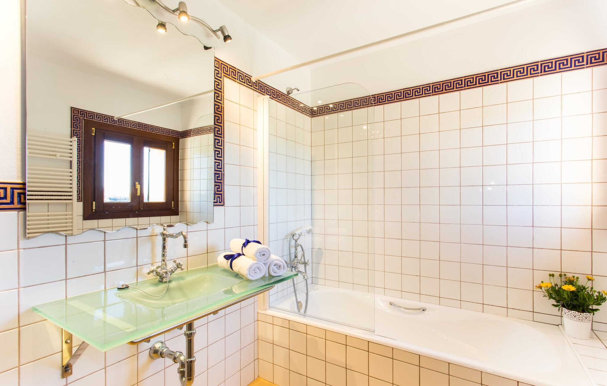 Der Innenraum von „Son Ropit“ ist hell und freundlich. Ein eleganter Eingangsbereich führt in ein sommerlich dekoriertes Wohnzimmer. Eine breite Glastür ermöglicht den einfachen Zugang zur überdachten Terrasse. Gleich daneben: eine gut ausgestattete Küche, in der Sie Ihr Frühstück mit frisch gemixten Fruchtsäften verfeinern können. Der Essbereich mit Kamin ist in die Küche integriert. Ebenfalls im Erdgeschoss befindet sich ein komfortables Schlafzimmer mit Doppelbett und ein separates Badezimmer mit Badewanne. Die Treppe am Eingang führt hinauf in das Obergeschoss. Es beherbergt weitere zwei Doppelschlafzimmer, von denen eines Zugang zu einer großen, überdachten Terrasse mit sensationeller Aussicht hat. Auf dieser Ebene gibt es außerdem zwei individuelle Badezimmer mit Badewannen und eine weitere Sonnenterrasse mit Blick auf den Pool. Für gesellige Abende finden Sie ein gutes Angebot an Gesellschaftsspielen. Das Ferienhaus liegt ca. 10 Autominuten von Manacor und dem lebhaften Ferienort Portocristo entfernt. Beide Städte bieten gute Einkaufsmöglichkeiten. Die wunderschönen Sandstrände von Cala Millor, Cala Mendia, S'Illot und Sa Coma sind etwa 12 Autominuten entfernt.