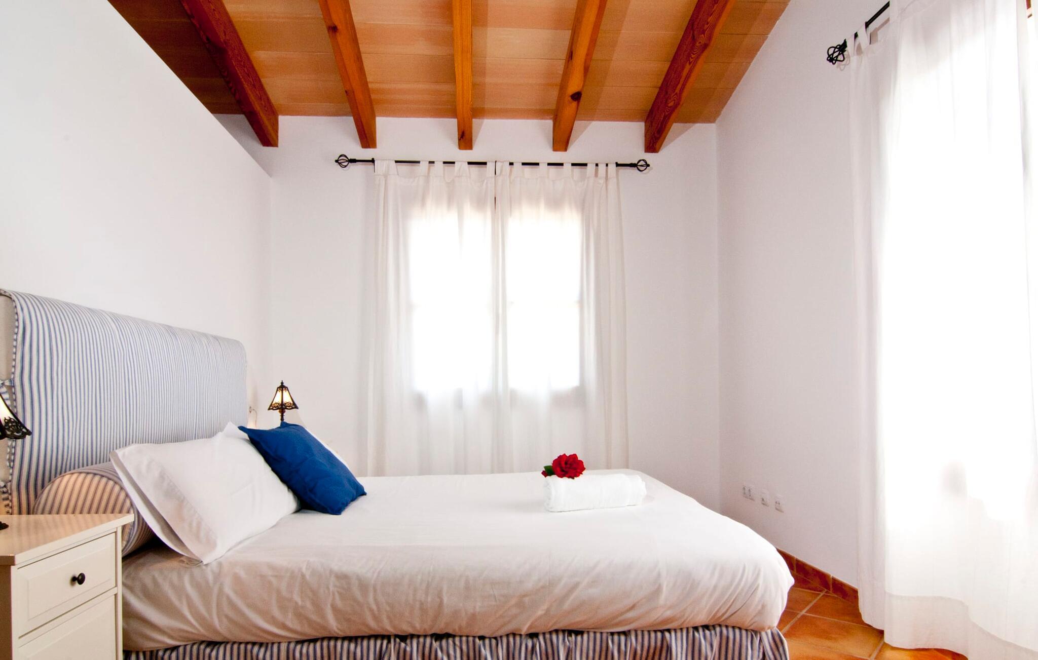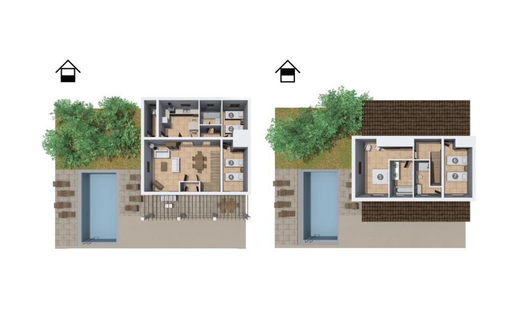 Die Innenfläche der Villa ist auf zwei Etagen aufgeteilt. In der pflegeleichten Küche findet man von Backofen, Herd und Mikrowelle über Spülmaschine und Kühlschrank bis hin zu Wasserkocher und Kaffeemaschine alles, was man für den täglichen Gebrauch braucht. Dieser Raum ist so großzügig abgetrennt, dass noch bequem Platz für einen weiteren kleinen Esstisch bleibt. Im kombinierten Wohn-/Esszimmer finden Sie eine gemütliche Sofaecke mit Sat-TV und bequemen Sitzmöbeln. Gleich daneben steht ein schöner Massivholztisch mit den passenden Stühlen. Es bietet Platz für sechs Personen. Die Mischung aus zurückhaltender Dekoration und geschmackvollen Möbeln verleiht diesem Raum eine sehr gemütliche und einladende Ausstrahlung. Die Schlafzimmer (zwei davon mit eigenem Bad) sind großzügig geschnitten und mit schönen Möbeln und Materialien ausgestattet sowie liebevoll gestaltet und individuell ausgestattet. Der Verzicht auf viele störende Accessoires verleiht diesen Räumen einen hellen und entspannenden Charme. Den Gästen stehen folgende Betten zur Verfügung: ein Doppelbett mit den Maßen 1,60 x 2,00 m und insgesamt sechs Einzelbetten mit den Maßen 0,90 x 1,90 m. Die hellen Badezimmer sind geschmackvoll gestaltet und ebenso funktional ausgestattet. Haartrockner und Bügeleisen stehen Ihnen zur Verfügung.