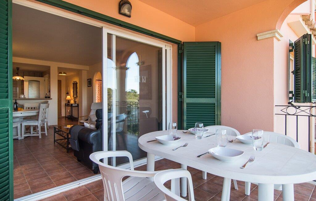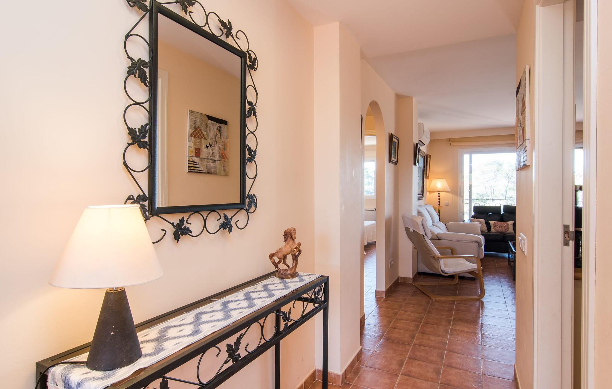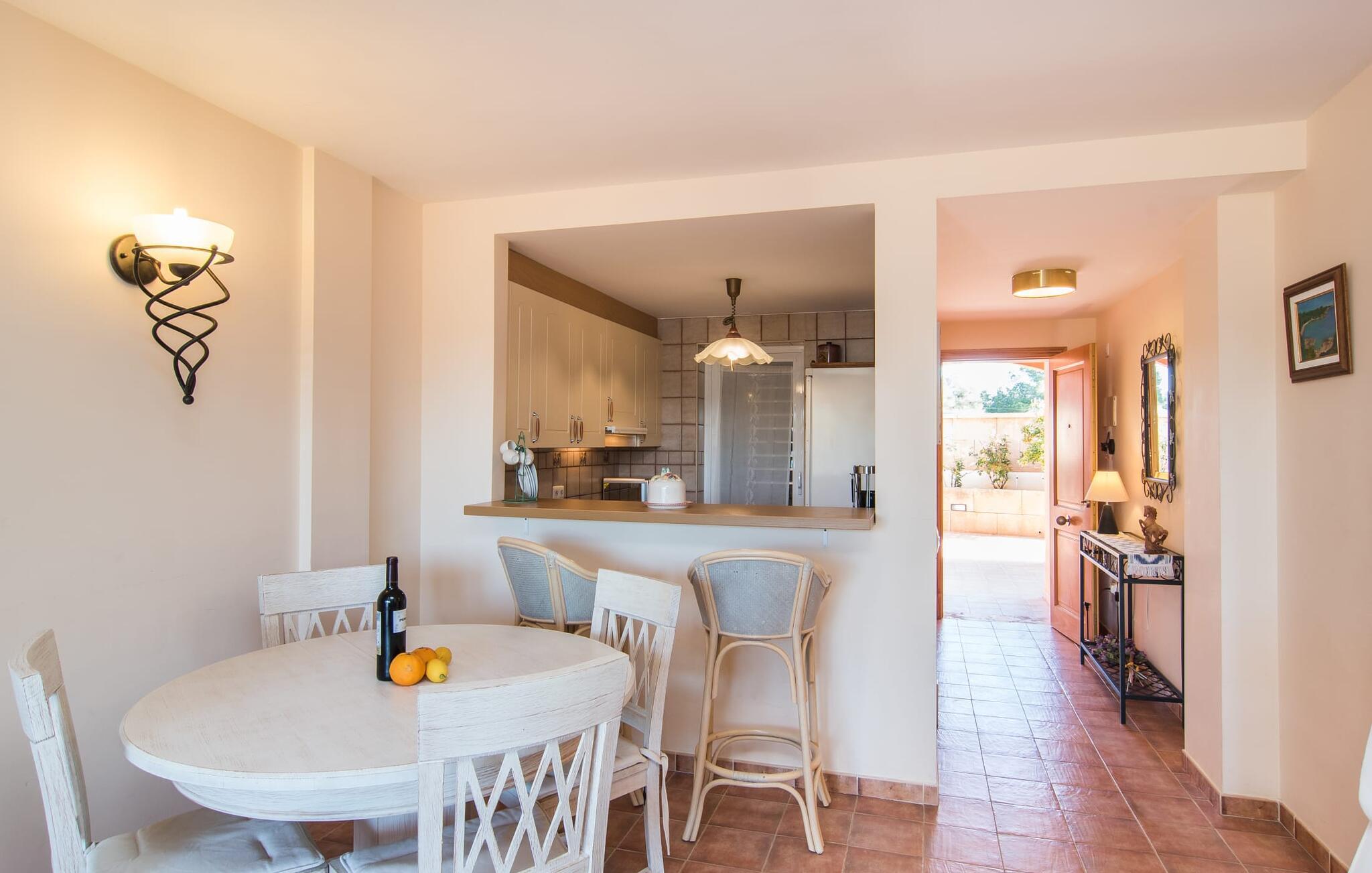 Der klimatisierte Wohnraum der Ferienwohnung wirkt hell und freundlich, die Glasfront lässt sich zum Balkon hin öffnen und bringt das Grün der Pinien direkt an den runden Esstisch. Zwei Sofas laden zu Film- und Fernsehabenden ein, ein DVD-Player ist ebenfalls enthalten und ein Smart-TV mit Netflix, den Sie über einen eigenen Zugang nutzen können. Die Einbauküche, ausgestattet mit Geschirrspüler, Herd und Mikrowelle, passt perfekt auf kleinem Raum und hält über eine Bar den Kontakt nach außen, die auch ein toller Ort für den kleinen Snack zwischendurch ist. Zwei Schlafzimmer, eines mit einem 1,50 m breiten Doppelbett und einem Schreibtisch und eines mit zwei getrennten Betten, teilen sich das geflieste Badezimmer mit Duschwanne. Wer gerne im Süden Mallorcas unterwegs ist, gerne Strände besucht und Ausflugsmöglichkeiten in Richtung Palma schätzt, findet hier ein tolles Selbstversorger-Apartment, in dem sich eine Familie pudelwohl fühlt oder sich zwei Personen gemütlich ausbreiten können.