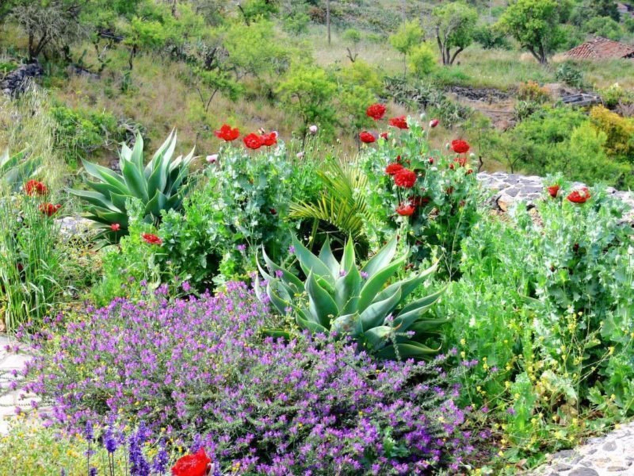 * Spazierwege und Sitzgelegenheiten in der parkähnlichen Gartenanlage, * 3 Sonnenterrassen mit Gartenmöbeln, Liegen und Schirmen, * Schwimmbecken, abdeckbar, beheizbar * Liegewiese, * subtropischer Blumen- und Sträuchergarten mit Kräuterecke: Oregano, Thymian, Basilikum, Salbei, Knoblauch * Parkplätze vor der Villa * Brachland mit ökologisch wichtigen kanarischen Kiefern, naturbelassenen Feigen- und Mandelbäumen, > Opuntien (Kaktusfeigen): Vorsicht - nicht berühren, schmerzhafte Stacheln!