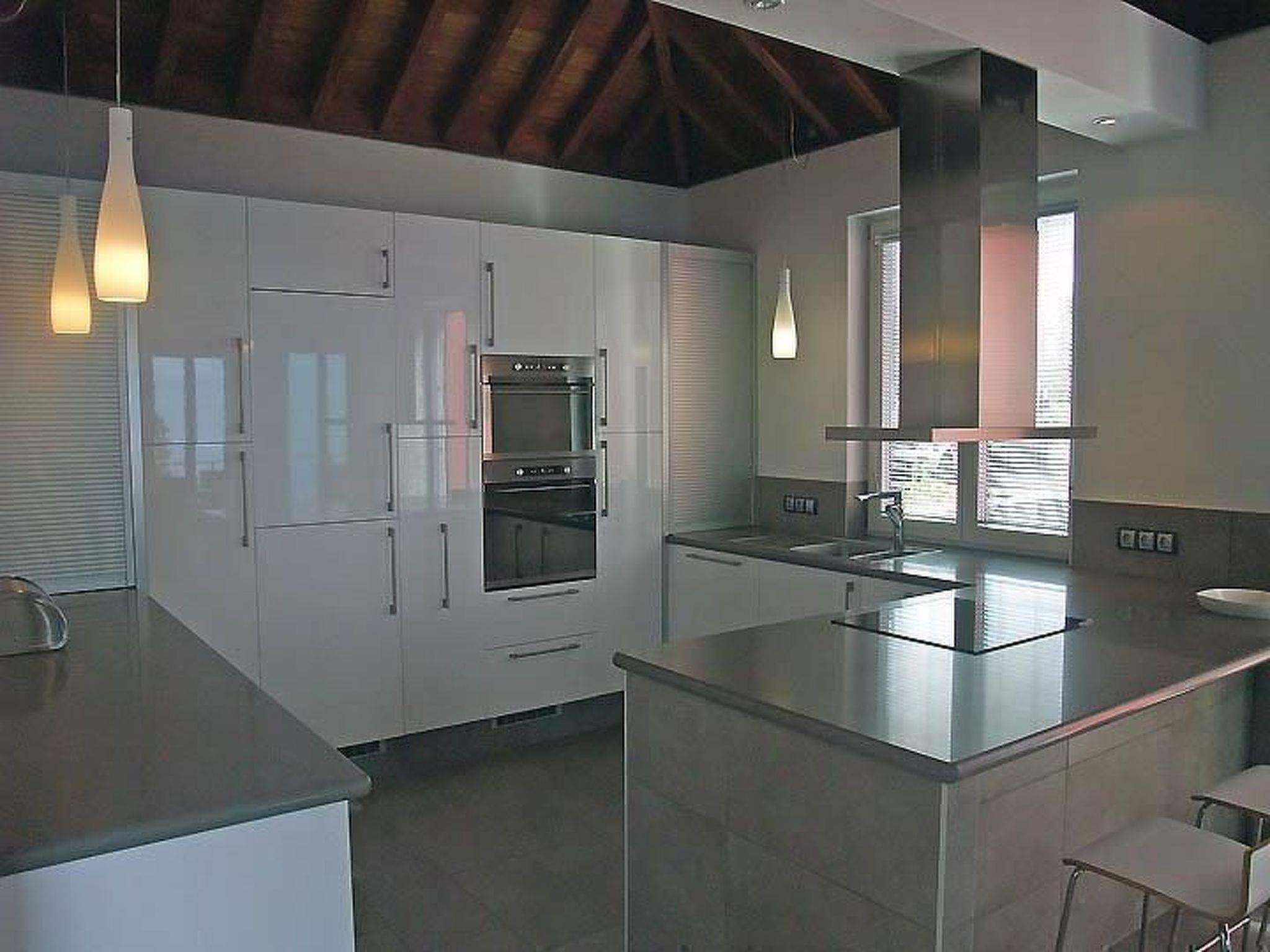 Herrliche gelegene, neue Architektenvilla im sonnigen Westteil der kanarischen Insel La Palma: +Architekten-Villa mit Komfort-Einrichtung +typischer Baustil der Insel mit sichtbarer Innenholzdach - Konstruktion, + raumhohe Fenstertüren, + elegante, hochwertige Fliesen für Bad, Boden und Terrassen, + ruhige Alleinlage auf 10 Tsd. qm Grundstück , + fantastischer Panoramablick auf Atlantik und bewaldete Berghänge des Naturschutzgebietes "Caldera de Taburiente", + kein Blick auf Plastik-bedeckte Bananenplantagen, + eine Sauna bis zu sechs Personen befindet sich im Gartengeschoss des Hauses, + beheizter und abdeckbarer Pool, 8,4 x 4,2 m, 53 qm Wasserfläche, + große Teile des Grundstücks sind bewusst als ökologisch wertvolles Brachland belassen, aber um die Villa findet sich ein großes, stets gepflegtes, subtropisches Gartengelände mit Spazierwegen, blühenden Pflanzen während des ganzes Jahres, + kein Durchgangsverkehr, Privatstraße zum Haus, + Parkplätze vor der Villa, steile Anfahrt, aber mit allen Autotypen befahrbar Wir weisen besonders darauf hin, dass alle Nebenkosten für Warm- und Kaltwasser, für Elektrizität, für Heizung, für Bad- und Bettwäsche, für Handtücher, Strandtücher, Geschirrtücher, für Internet-ADSL Zugang mit WLAN, für Waschmaschinen- und Trockner-Nutzung, Kaminholz, für Gemeindegebühren, im Preis enthalten sind. Die Kosten für die Endreinigung beinhalten ebenfalls die Poolreinigung. weitere Ausstattung: 2 - 8 Personen, * geräumiger Wohn- und integrierter Essbereich mit drehbarem Designer- Kamin, mit SAT-TV unf großem Flachbildschirm, mit DVD Spieler, mit Buch-, Musik- und DVD-Bibliothek, mit Telefon und Internet-ADSL-Zugang und WLAN/ WIFI * bestens ausgestattete Küche mit energiesparendem Induktionsherd, mit zwei getrennten Kühl- und Tiefkühlschränken, aus Energiespargründen einzeln abschaltbar, weiterer Kühlschrank im Keller nutzbar. * 4 Schlafzimmer mit 200x200 cm Doppelbetten, beste deutsche Qualität mit Lattenrosten und 1A Matratzen, * 3 Bäder jeweils mit Regendusche, Doppelwaschbecken, WC und Bidet * Gäste-WC, Balkon, * Warmwassergewinnung und Heizungsenergie aus ökölogischen Thermosolar- und Luft-Wärmepumpe Geräten