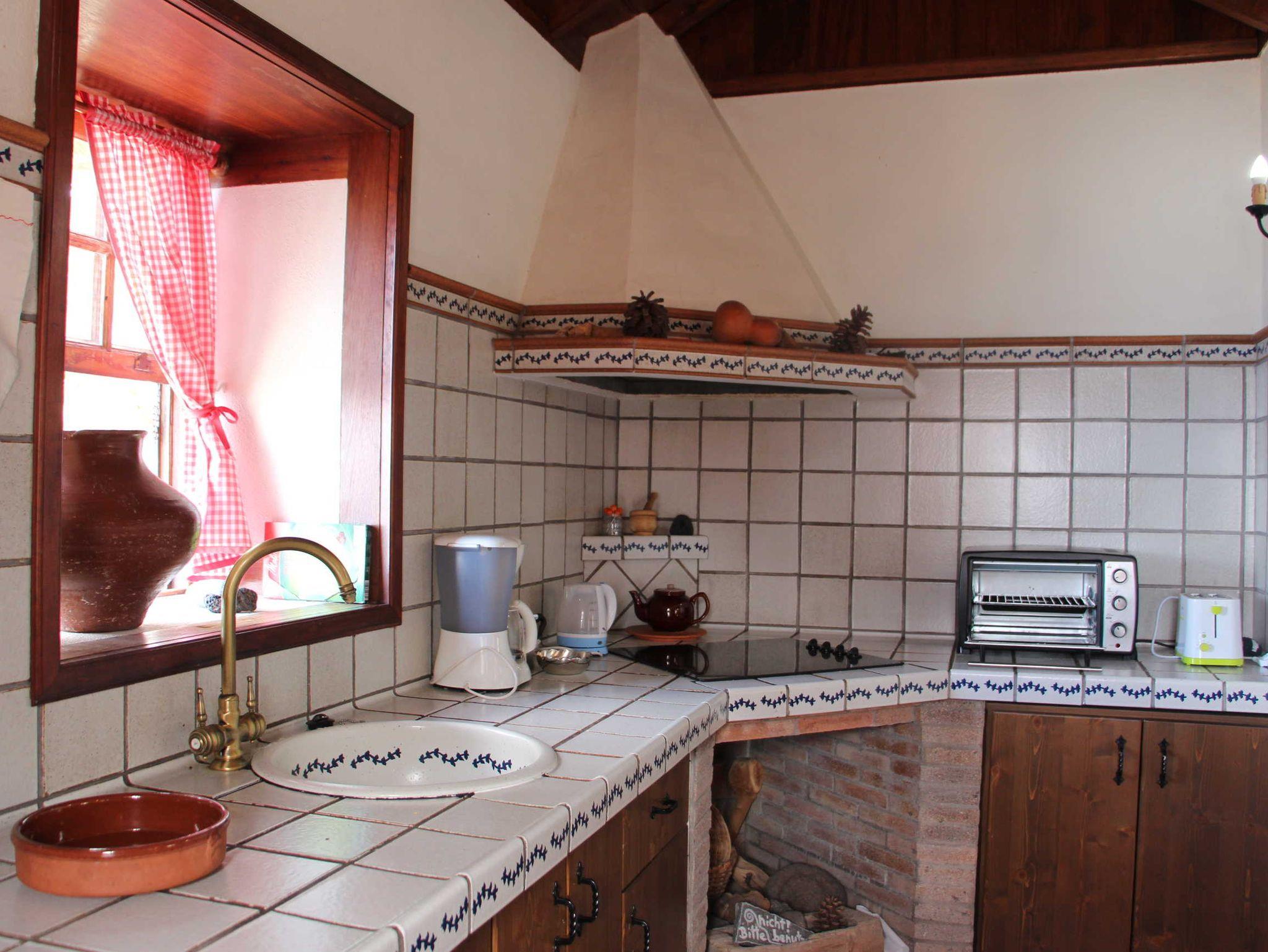 Der Wohnbereich wurde schlicht gehalten mit einer schönen alten Holztruhe, einen Sofa mit großem Sat-TV (Flachbildschirm) und einem Esstisch mit 2 Stühlen. Auch in der Küchenzeile tauchen wieder Dekoelemente aus alten Zeiten auf und geben dem Haus seinen eigenen Charme. Die Küchenzeile ist gut ausgestattet, auch vom Küchenfenster hat man Blick auf das Meer.