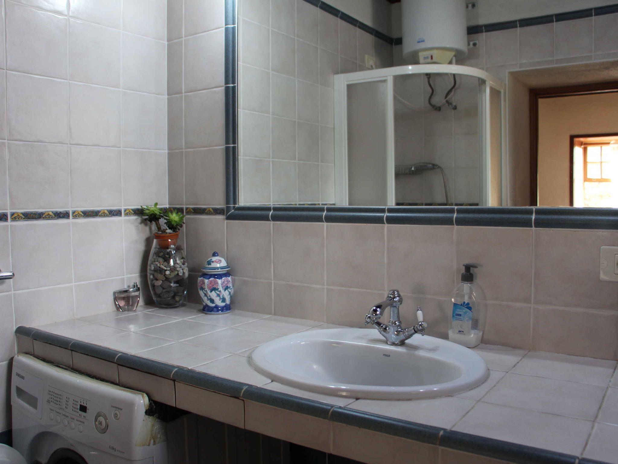 Im hinteren Teil des Hauses befindet sich das Schlafzimmer mit 2 Einzelbetten und einem großen Schrank sowie ein daran anschließendes Bad mit Dusche/WC und Waschmaschine.