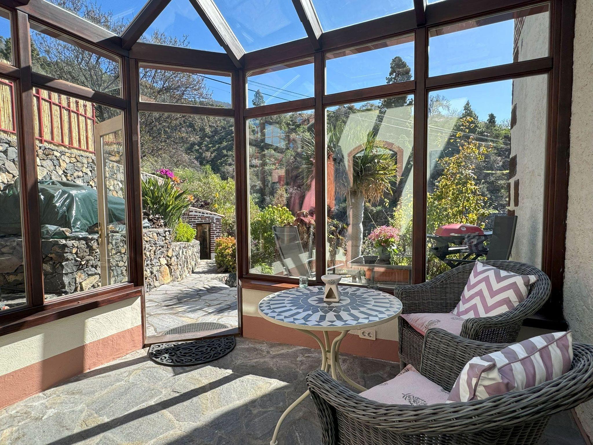 Der verglaste, überdachte Eingangsbereich zum Haus bringt zusätzliches Tageslicht und erwärmt das Haus tagsüber auf natürliche Weise im Winter. Neben dem Kamin steht den Gästen ein Elektroheizer zur Verfügung.