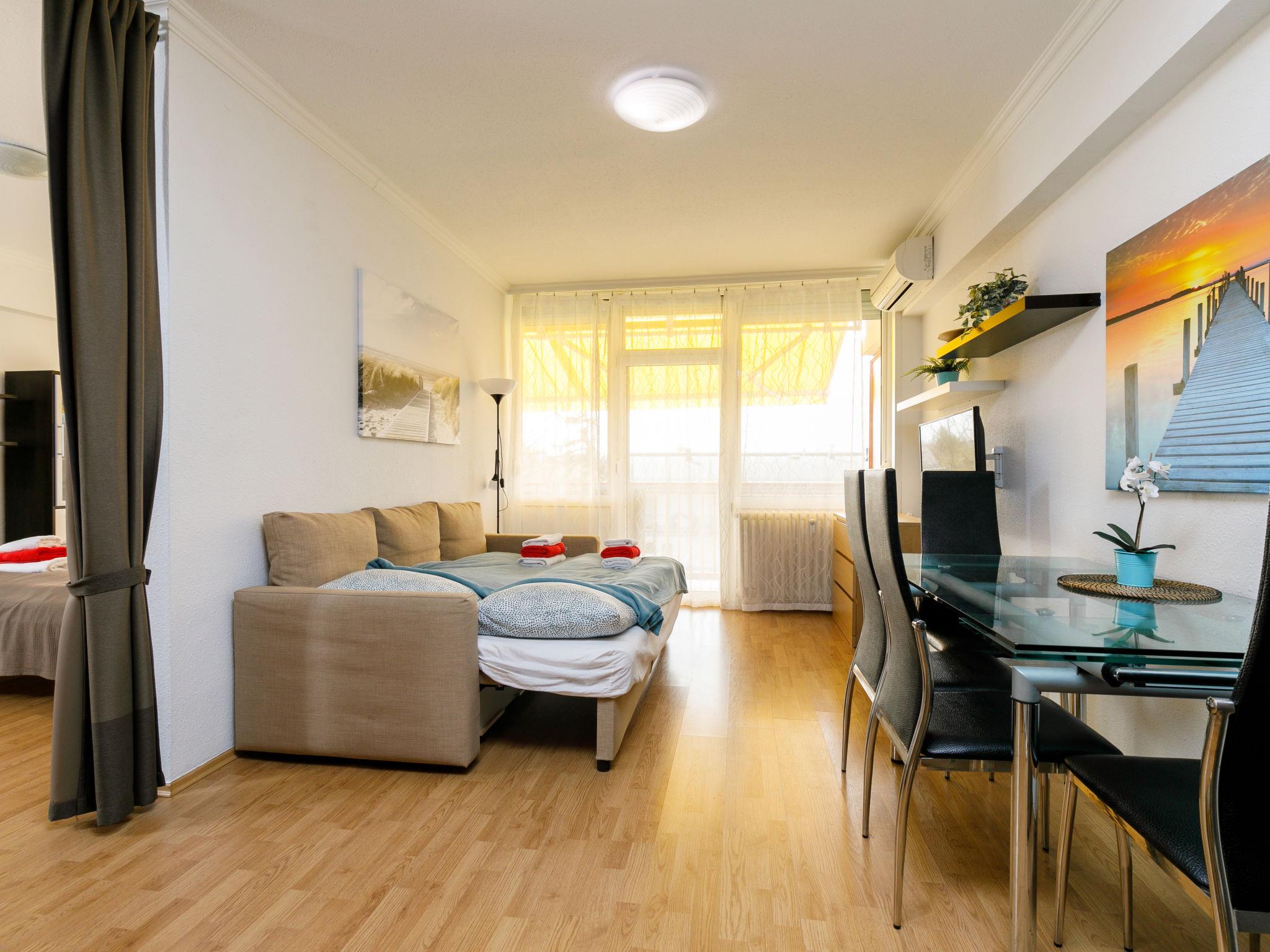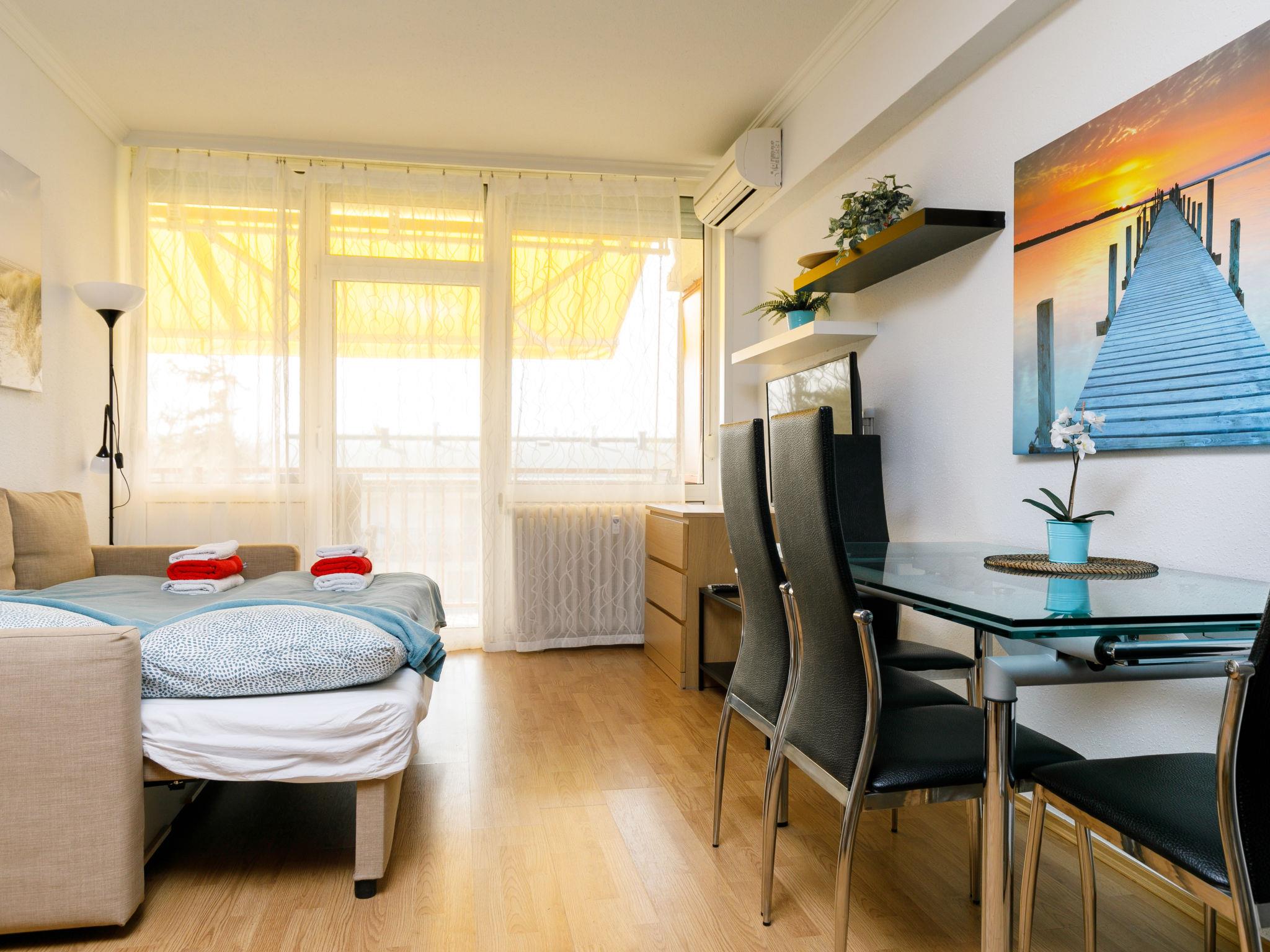 "Zamia 1", 2-Zimmer-Wohnung im 3. Stock, Südwestlage. Teilweise renoviert, zweckmässig und komfortabel eingerichtet: 1 offenes Doppelzimmer mit 1 franz. Bett (160 cm, Länge 200 cm). Ausgang zum Balkon. Wohn-/Schlafzimmer mit 1 Doppeldiwanbett (140 cm, Länge 200 cm), Esstisch, Kabel-TV und Klimaanlage. Ausgang zum Balkon. Offene Küche (Backofen, 4 Glaskeramikplatten, Toaster, Wasserkocher, Mikrowelle, Tiefkühler). Dusche/WC. Keine Heizmöglichkeit. Balkonmöbel. Schöne Panoramasicht auf den See. Zur Verfügung: Fliegengitter, Kinderhochstuhl, Babybett (extra). Internet (Wireless LAN). Parkplatz.